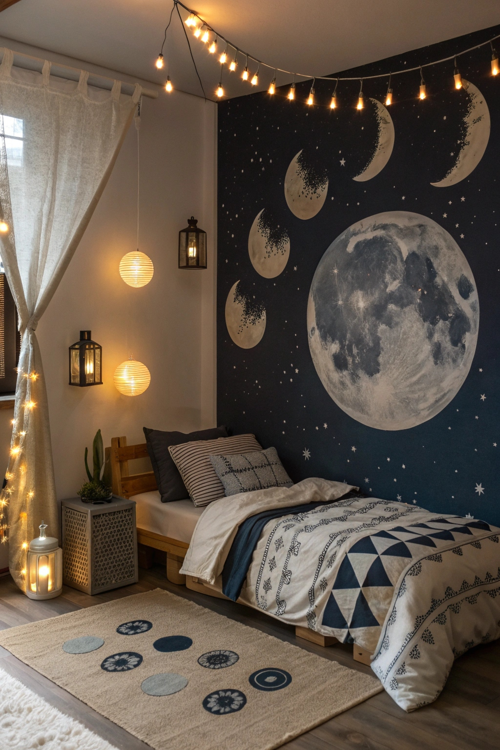 Bring the mystique of the moon into your bedroom with décor that celebrates its phases. Use canvas art or wall decals to depict the waxing and waning moon, creating a celestial mural. Complement these visuals with moon-themed bedding and cushions for a cozy, cohesive look. Incorporate soft lanterns or fairy lights to mimic lunar radiance, enriching the magical ambiance.