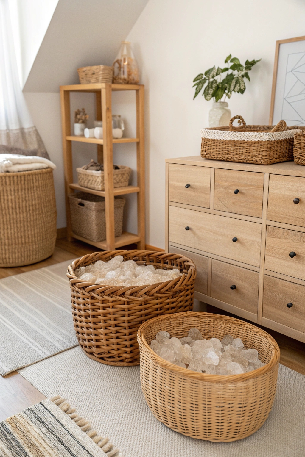 Wicker baskets add an organic, earthy texture to your room while providing an elegant way to organize and showcase your crystal collection. Mix basket sizes by placing larger ones on the floor and smaller ones on shelves or dressers to create visual layers. The natural fibers complement the witchy aesthetic and keep your space tidy and inviting.