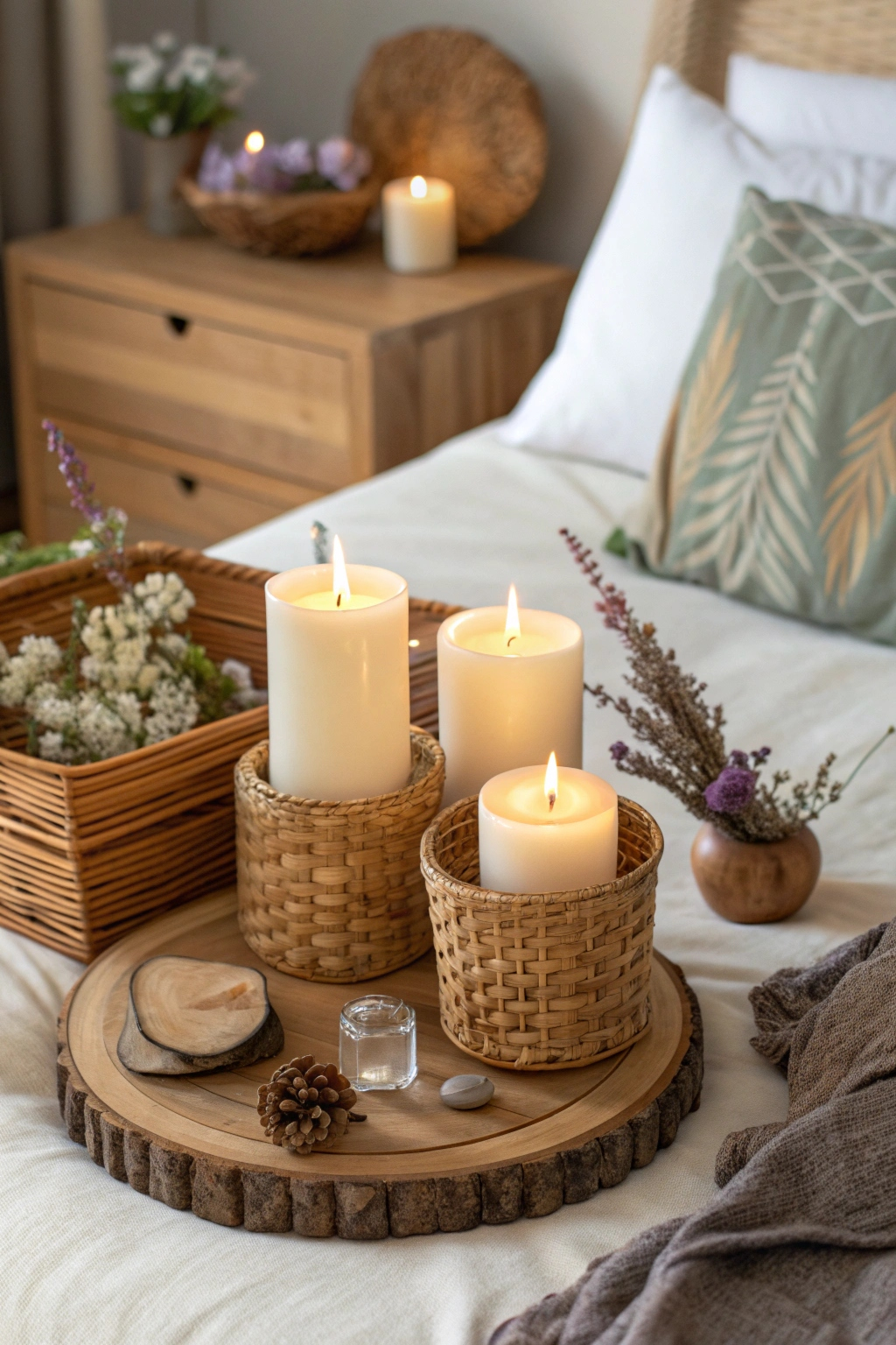Enhance the earthy charm of your wicker accents with thoughtfully arranged candles. Cluster candles of varying heights on a handcrafted tray or a natural wood slab to create a warm, inviting glow. Select fragrances like sage, sandalwood, or cedar to deepen the mystical atmosphere. Incorporate crystal holders or dried floral accents to elevate the visual appeal and spiritual energy.