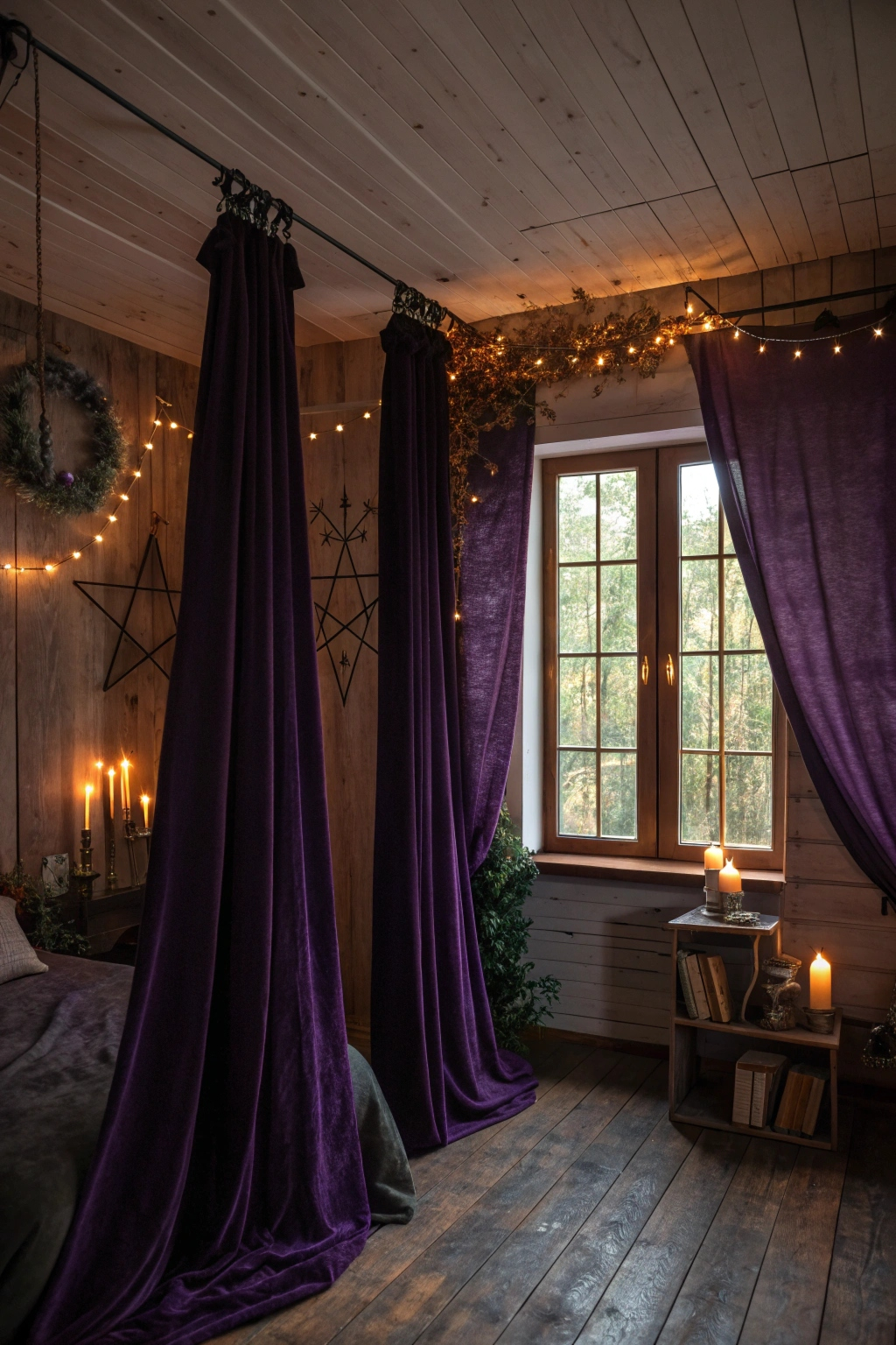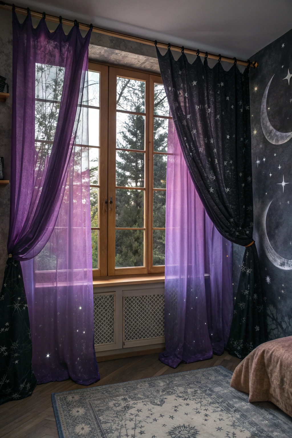 - Sheer curtains in deep purples or black for a mystical veil