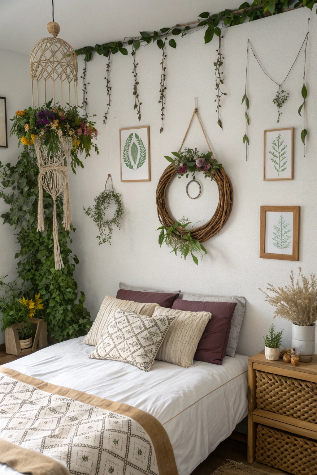 - Macramé plant holders showcasing lush greenery