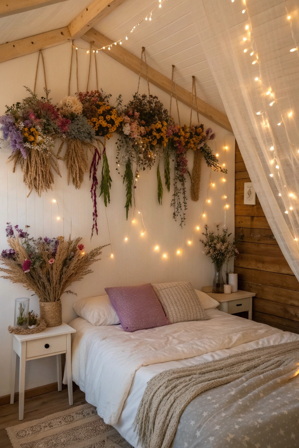 Dried flower bouquets bring timeless beauty and a natural touch to your bedroom. Place them on bedside tables or suspend them above your bed to complement your fairy lights. Experiment with various hues and flower types to reflect your personality and cultivate a peaceful, enchanted environment.