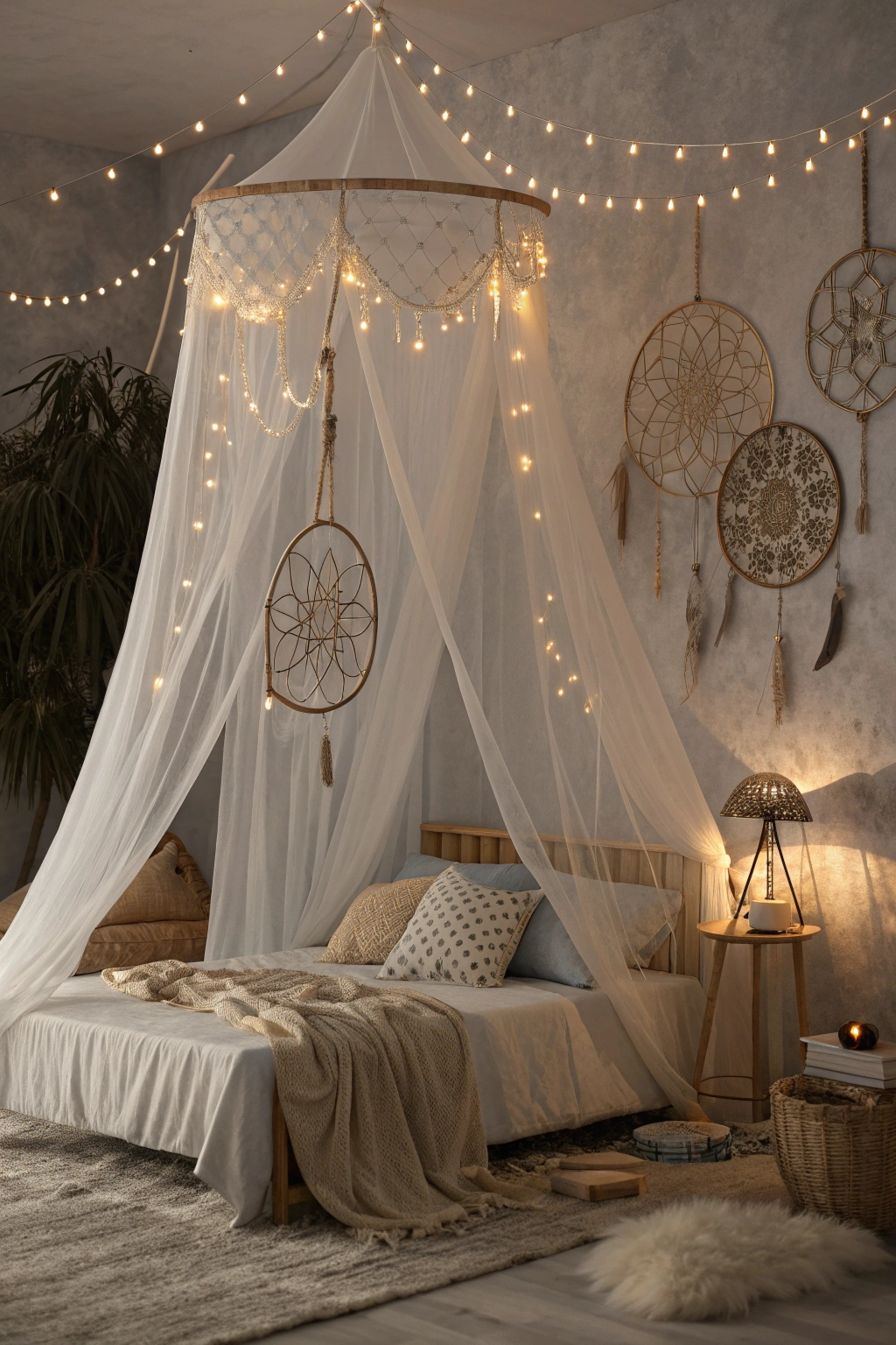 A canopy bed draped with sheer, flowing fabrics creates a whimsical centerpiece that invites relaxation and magic. Enhance this dreamy setup with: