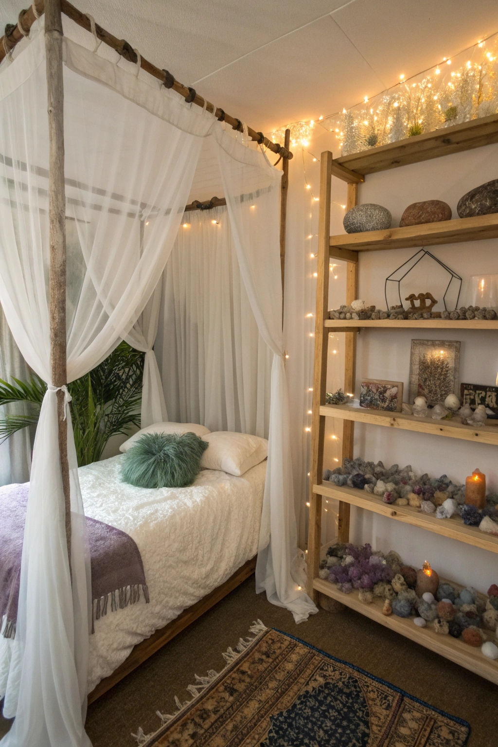 Complement your ethereal bed with crystal display shelves that highlight your collection’s beauty and energy. Choose shelving that matches your décor style-whether sleek glass or rustic wood. Organize crystals by color or size to create an eye-catching arrangement that radiates positive vibes.