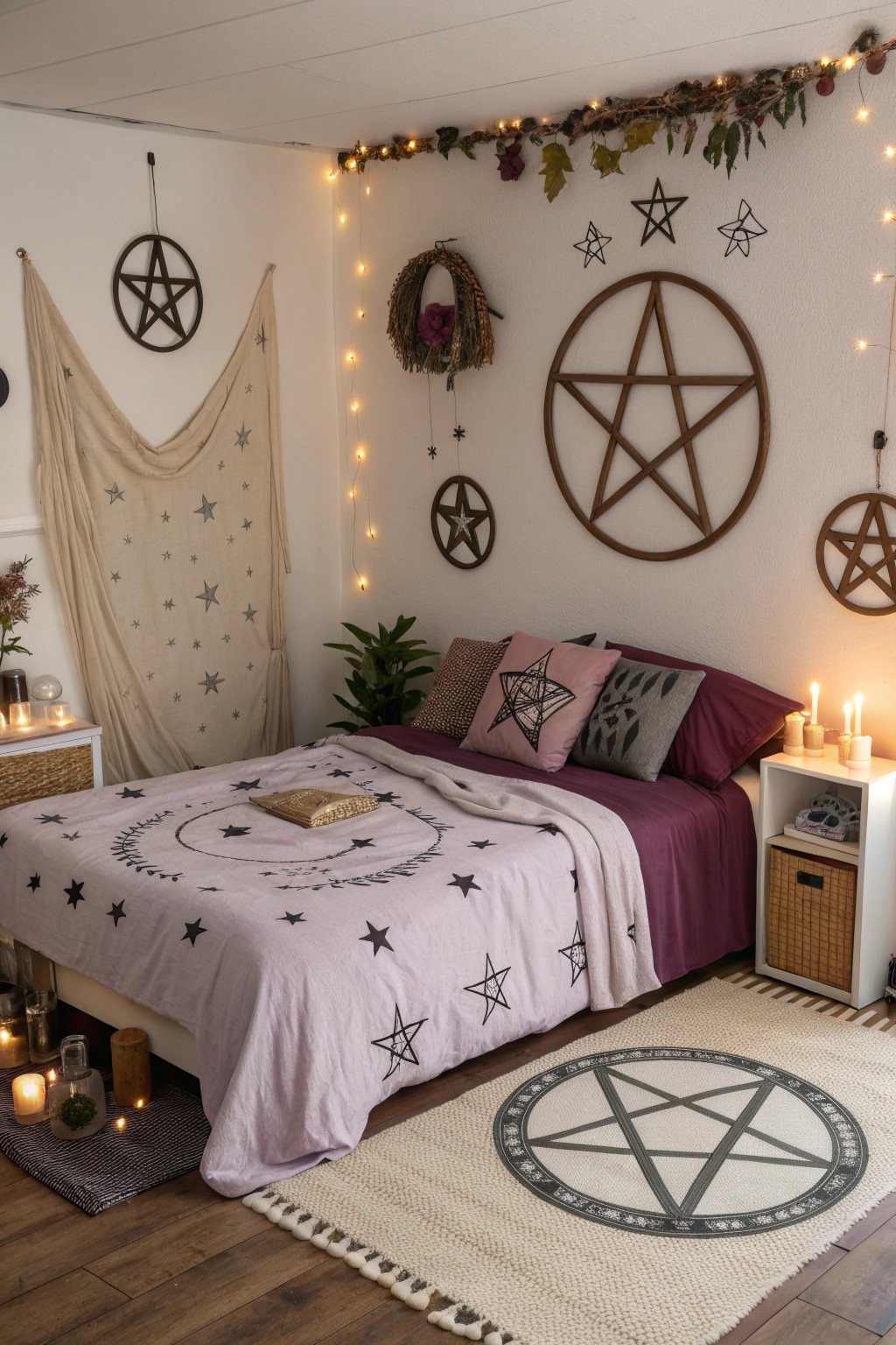 Incorporate pentagram motifs to deepen the mystical ambiance. Use pentagram wall art, decorative cushions, or bedding featuring this iconic symbol. Consider pentagram-shaped mirrors or candle holders to subtly enhance your witchy décor. These accents reinforce your personal style and spiritual symbolism.
