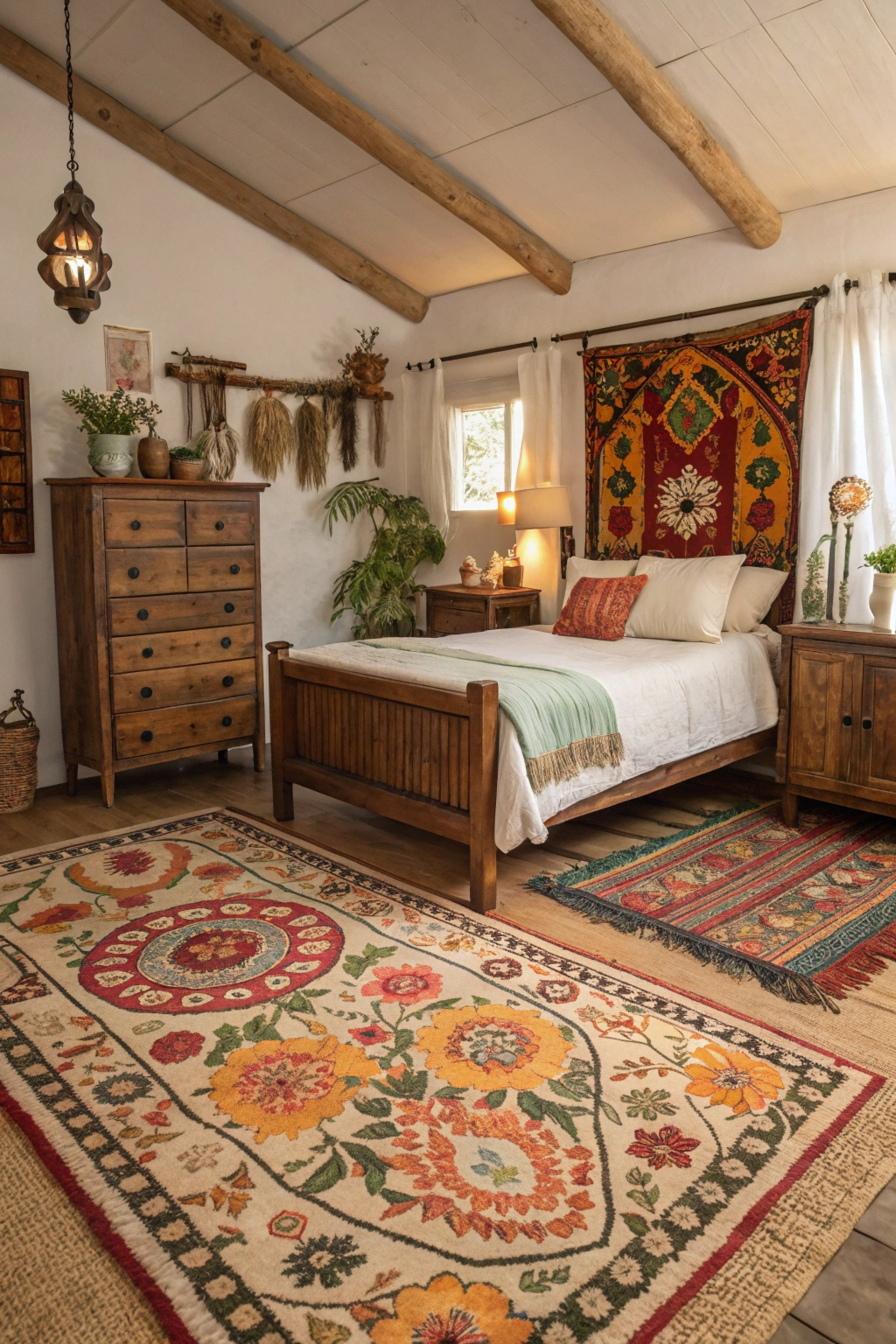 Complement vintage furnishings with bohemian rugs featuring intricate tribal or floral patterns. Layering different textures and warm tones adds dimension and enhances the magical vibe. This carefree style brings a playful yet grounded energy to your bedroom.