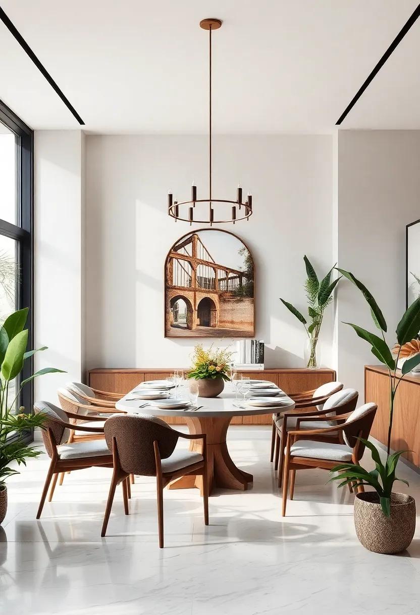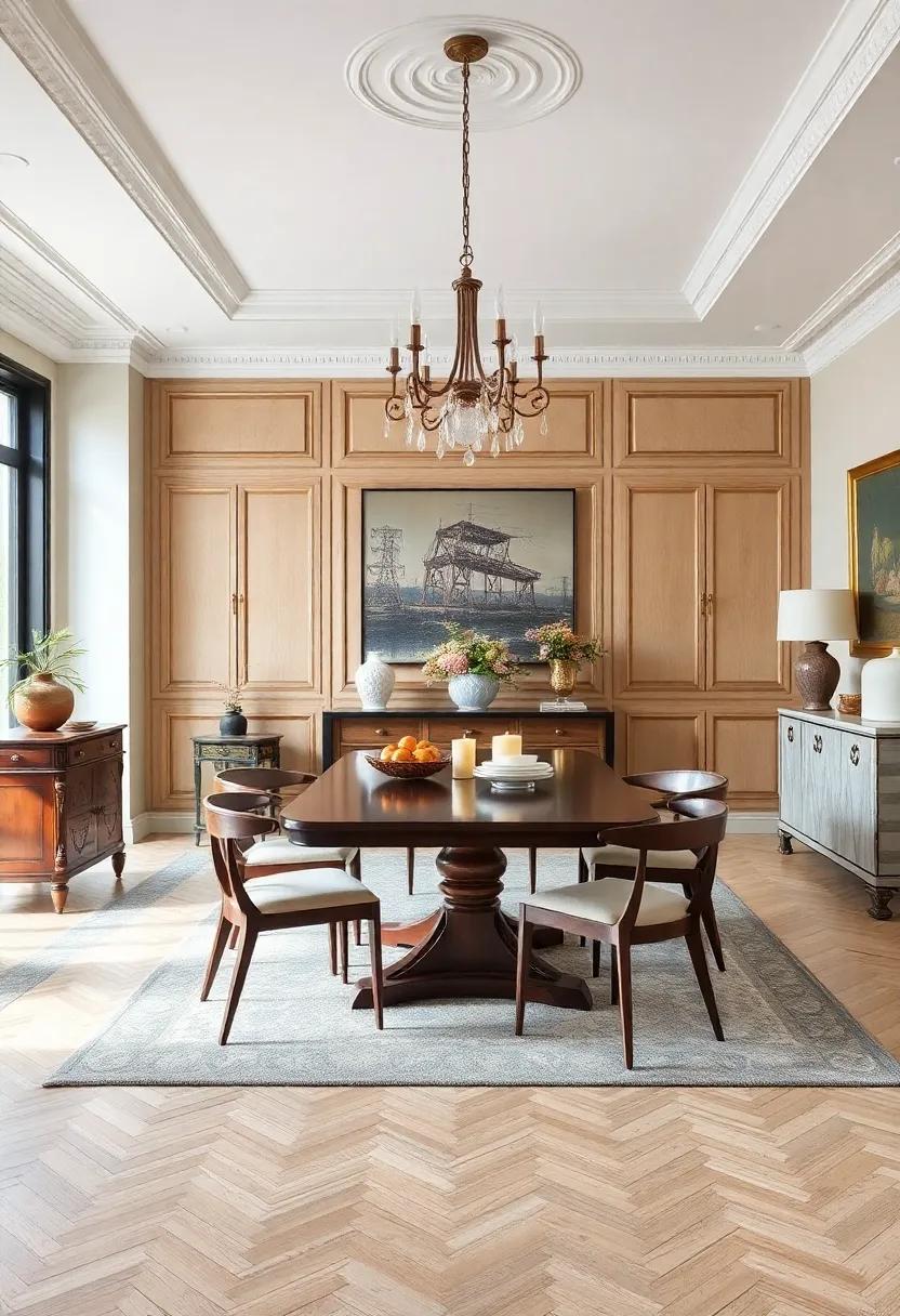 Imagine stepping into a dining room where the charm of antique pieces meets the crisp lines of contemporary design. This captivating juxtaposition creates a space that feels both warm and invigorating. Consider incorporating vintage wooden dining chairs next to a sleek glass table, allowing the textures to play off one another beautifully. A stunning chandelier with a modern twist can draw the eye upward, illuminating an aged dining credenza adorned with cherished heirlooms or artisanal pottery, reflecting a story of the past while embracing the aesthetics of today.