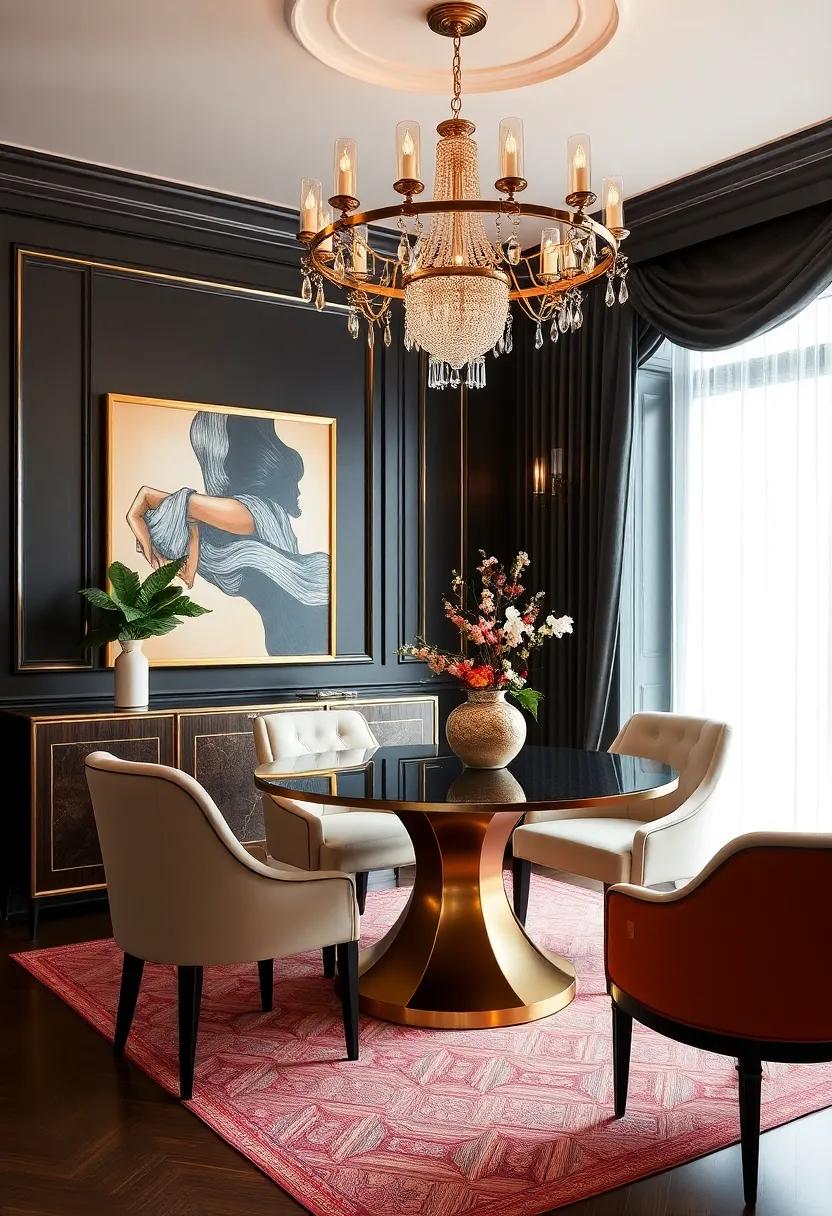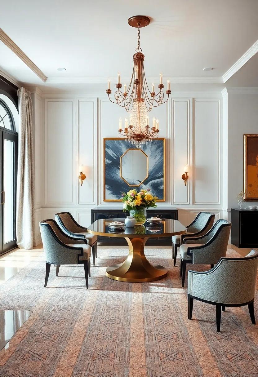 Don’t shy away from incorporating wall-mounted sculptures or even creating a dramatic feature wall with a multimedia installation. Use bold colors and intricate patterns in your artwork to complement the furnishings and color palette of your dining room. For a striking effect, arrange lighting to highlight specific pieces—perhaps a wall spotlight directed at a vibrant mural or a chandelier that reflects off a beautifully designed sculpture on the table. Each thoughtfully placed item not only enhances the visual appeal but also makes dining an immersive experience, leaving guests inspired and engaged.