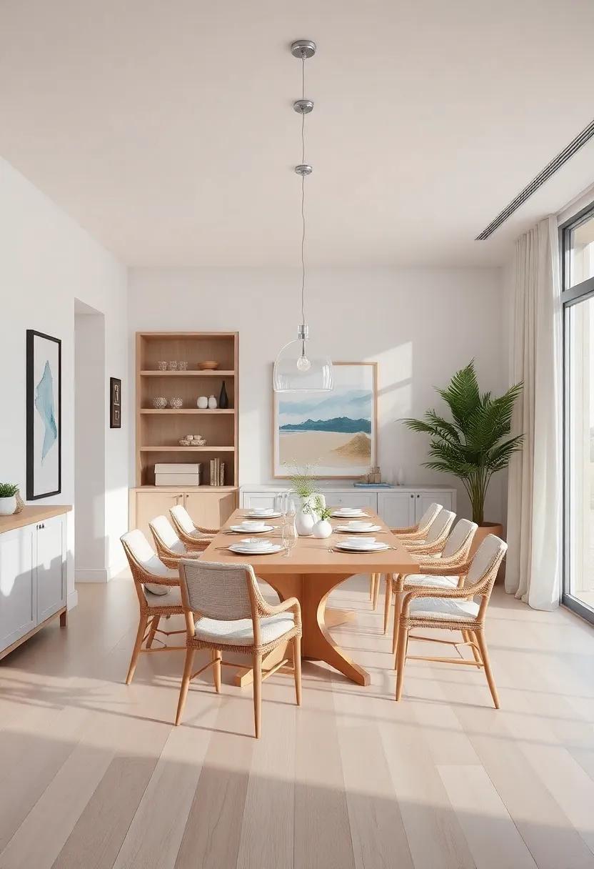 The balance of simplicity and style extends to the seating arrangements, where plush chairs upholstered in neutral fabrics invite comfort without overwhelming the aesthetic. Adding a woven pendant light can infuse the space with texture while serving as a focal point without detracting from the overall harmony. Consider placing a soft area rug underneath to define the eating space, unifying the elements of the room. In this carefully curated sanctuary, every piece—from the choice of tableware to the selection of decor—should resonate with the ethos of Scandinavian minimalism, celebrating functionality and beauty in equal measure.