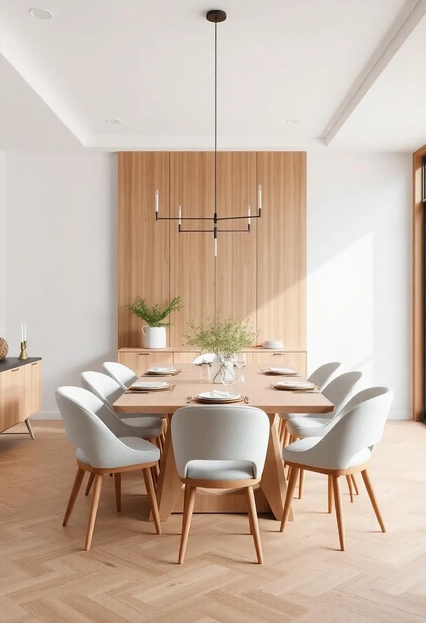 Understated Nordic Elegance: A palette of whites, greys, and soft pastels paired with natural wood crafts a serene, stylish dining room that embraces simplicity