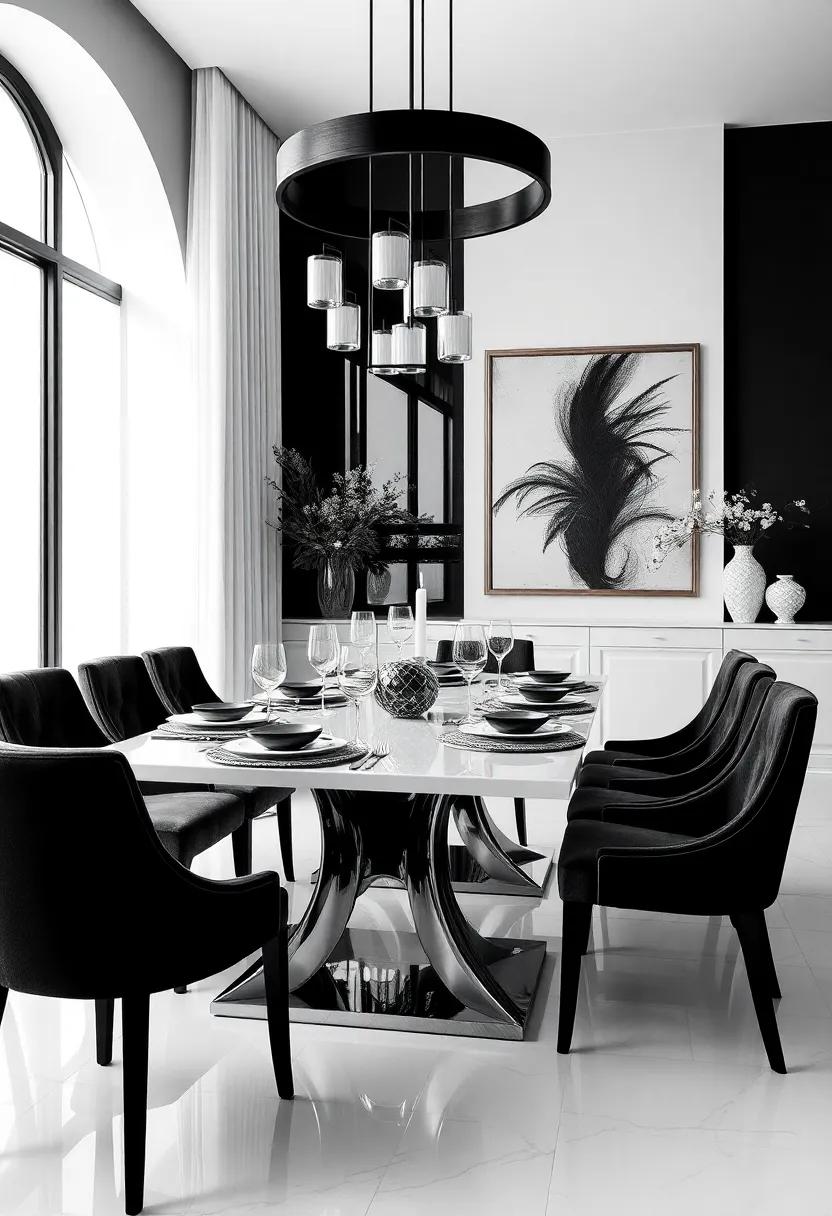 Luxury in Monochrome: Striking black and white elements, from dining chairs to table settings, define a chic and contemporary dining room flaunting a strong aesthetic