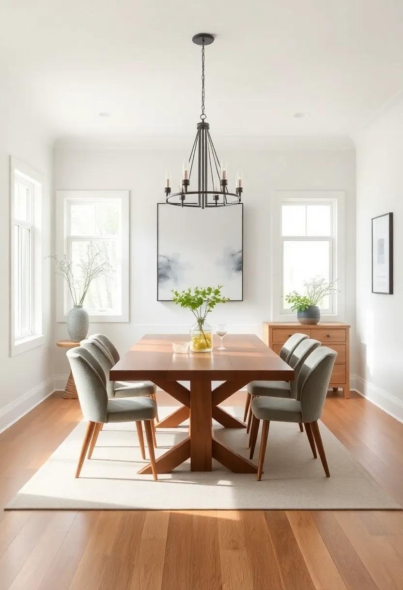 To enhance this serene setting, incorporate delicate accents that speak to the farmhouse ethos, such as vintage-inspired tableware and centerpieces of fresh flowers in rustic vases. The play of light within this aesthetic can be further emphasized by choosing warm-toned lighting fixtures that cast a soft glow, creating an atmosphere that is both relaxing and sophisticated.One might also consider adding mismatched but complementary chairs or side tables to encourage a lived-in feel, making your guests feel at home while elevating the overall design. These thoughtful touches culminate in a dining experience that beautifully marries rustic charm with contemporary comforts.