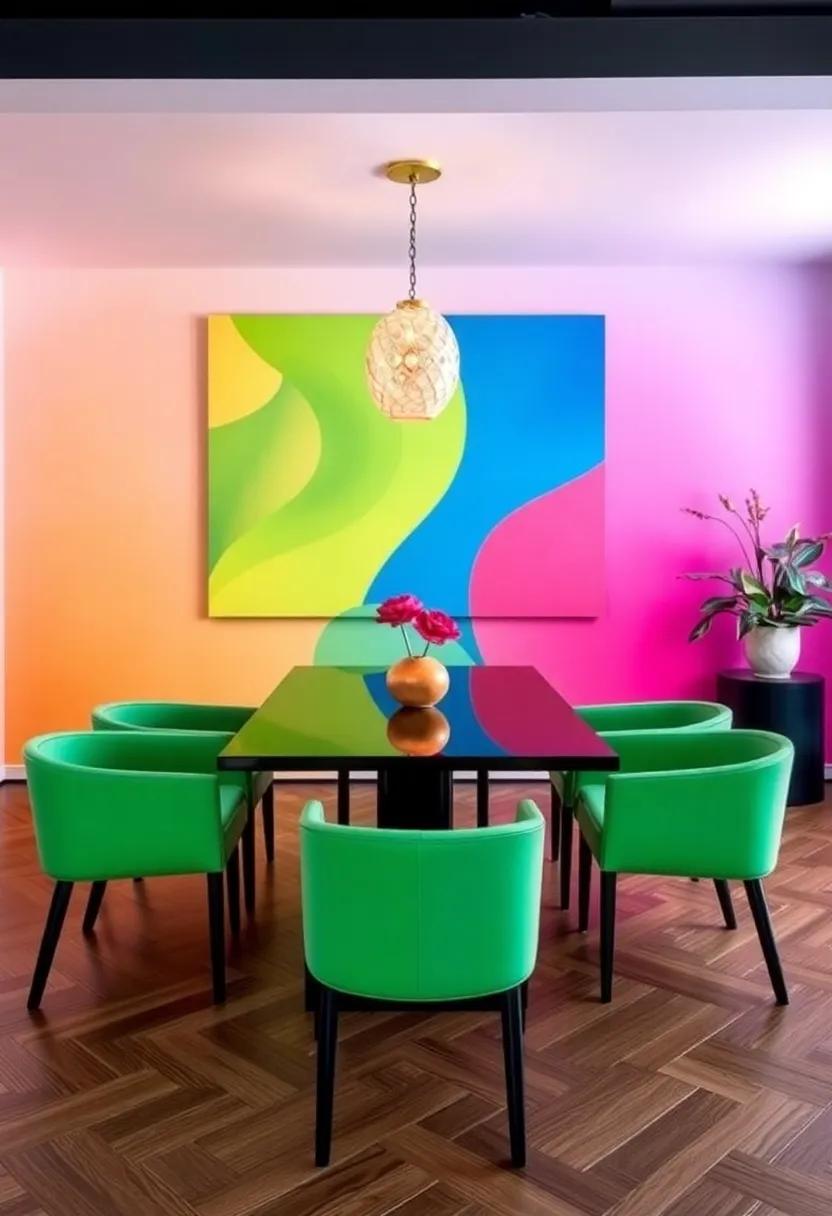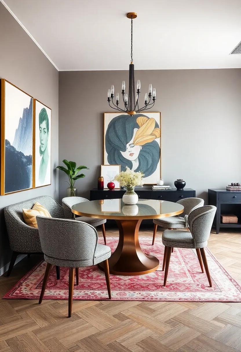 Eclectic Gallery Space: Transform your dining room into a personal gallery with bold artwork, varied seating styles, and a mix of textures for an artistic vibe