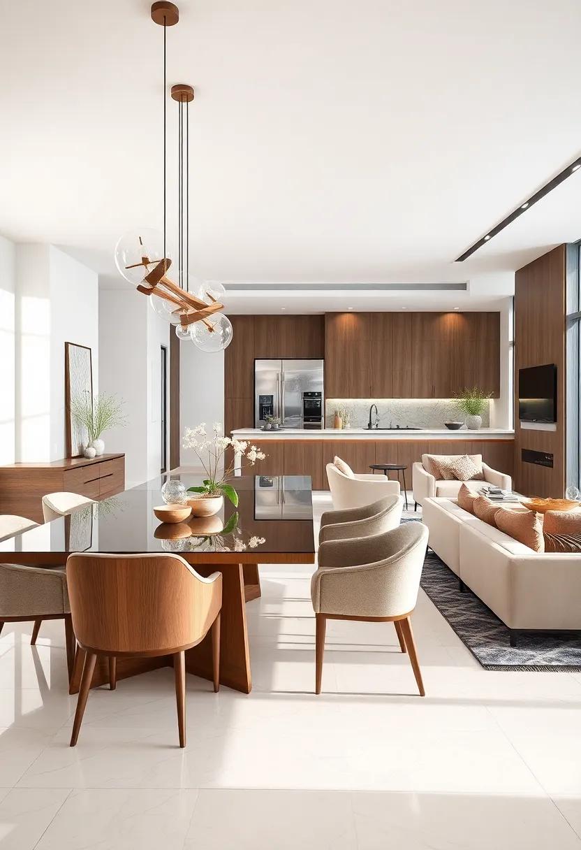 Stylish Open Concept: Fluid dining spaces that blend seamlessly with living areas offer versatility and an aesthetically pleasing environment for social gatherings