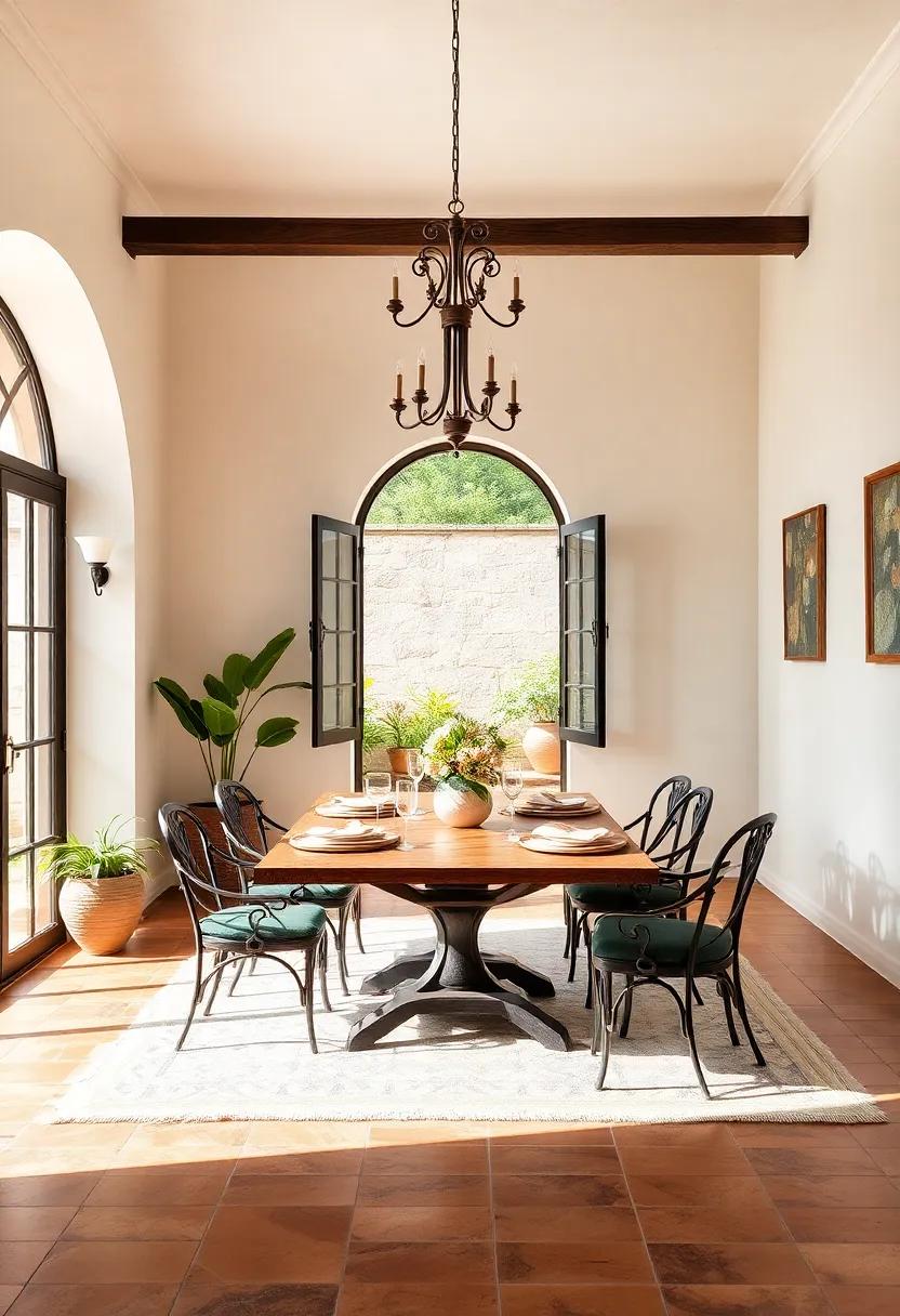 Mediterranean Warmth: Terra cotta tiles, stucco walls, and wrought iron fixtures cultivate a cozy dining area reminiscent of sun-soaked terraces