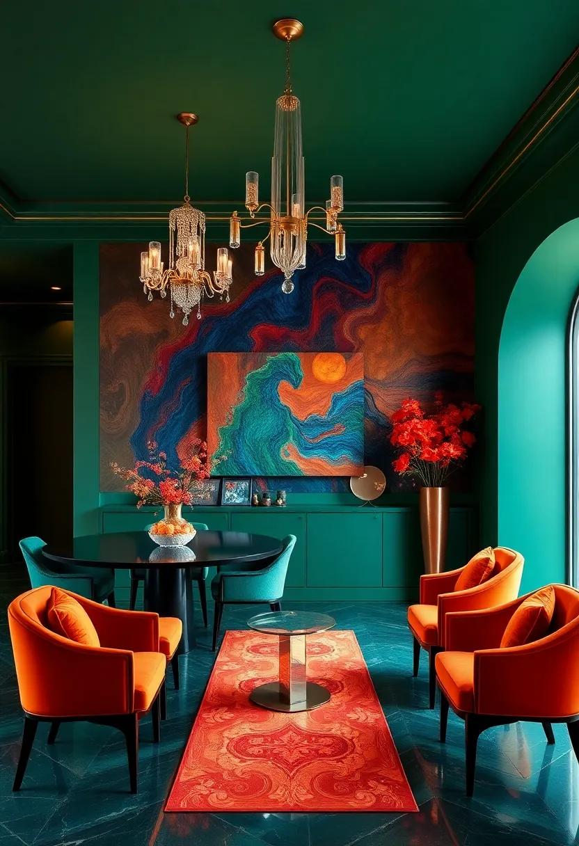 Rich Jewel Tones: Deep emeralds, royal blues, and vibrant oranges transform a standard dining room into an opulent, jewel-toned paradise