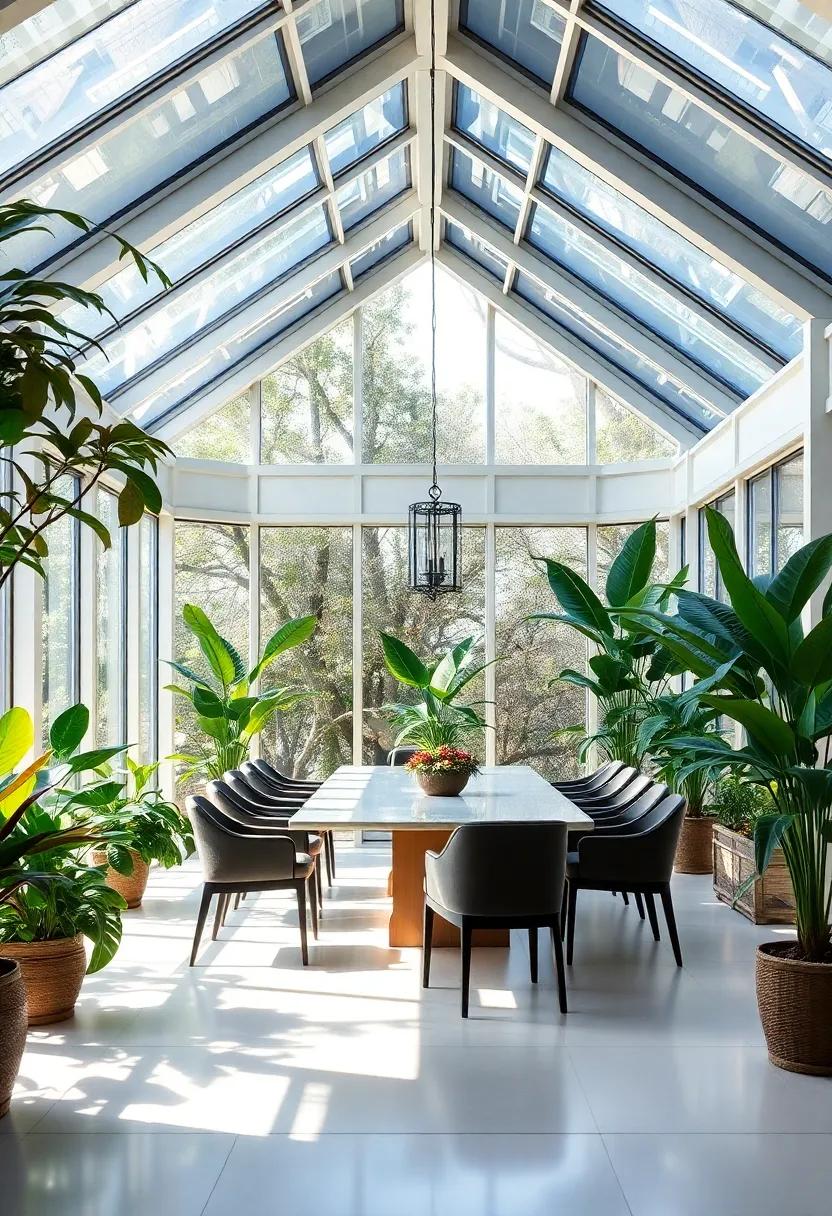 Grand Solarium Dining: Floor-to-ceiling windows and lush indoor plants create a bright, airy dining space that connects nature with elegant dining