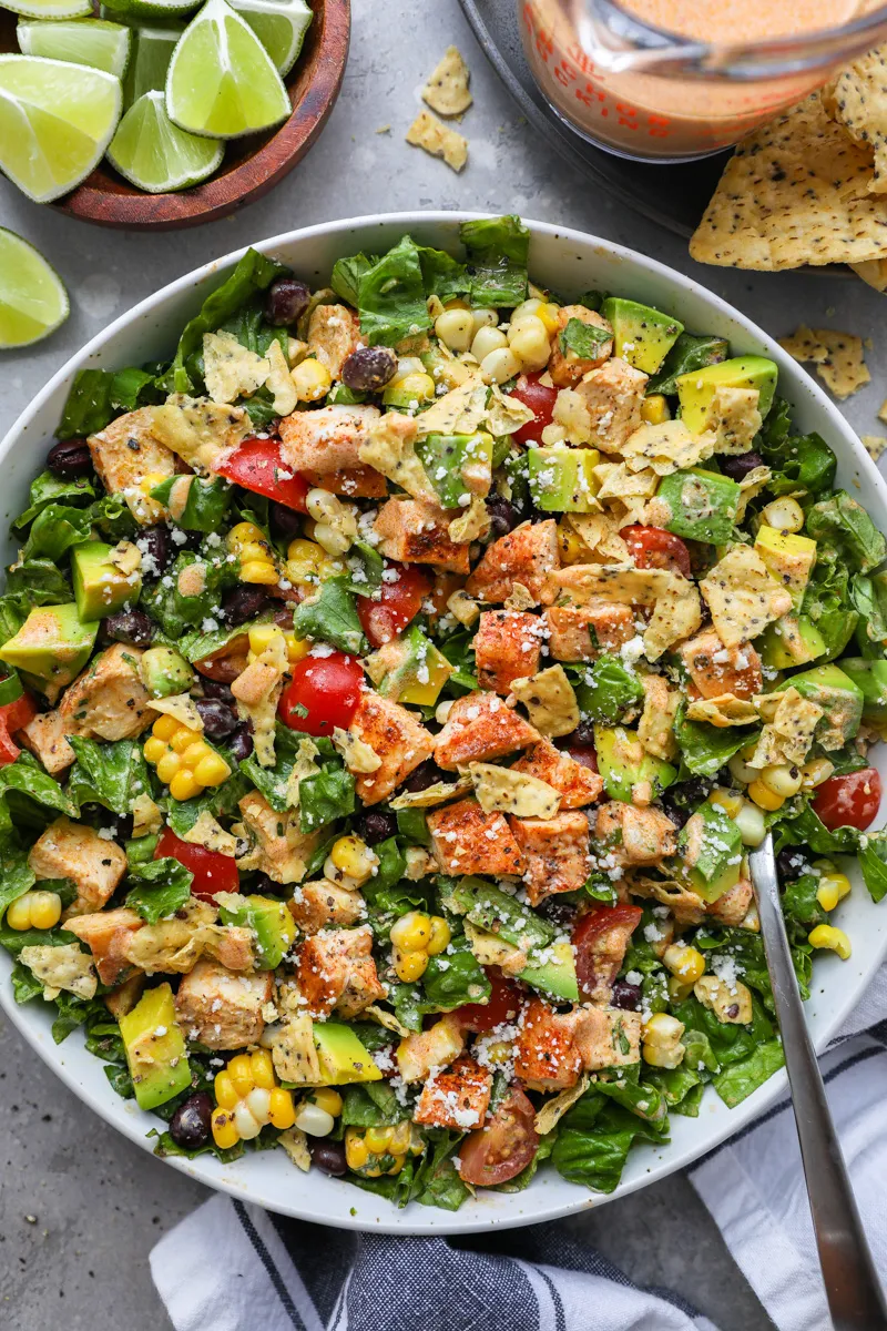 Combining juicy chili-lime chicken, smoky corn, creamy avocado, and crunchy tortilla strips, this salad is a flavor powerhouse. The smoky chipotle ranch dressing adds a game-changing depth of flavor. A dash of chipotle powder in the dressing introduces a subtle smoky heat that makes this dish unforgettable.