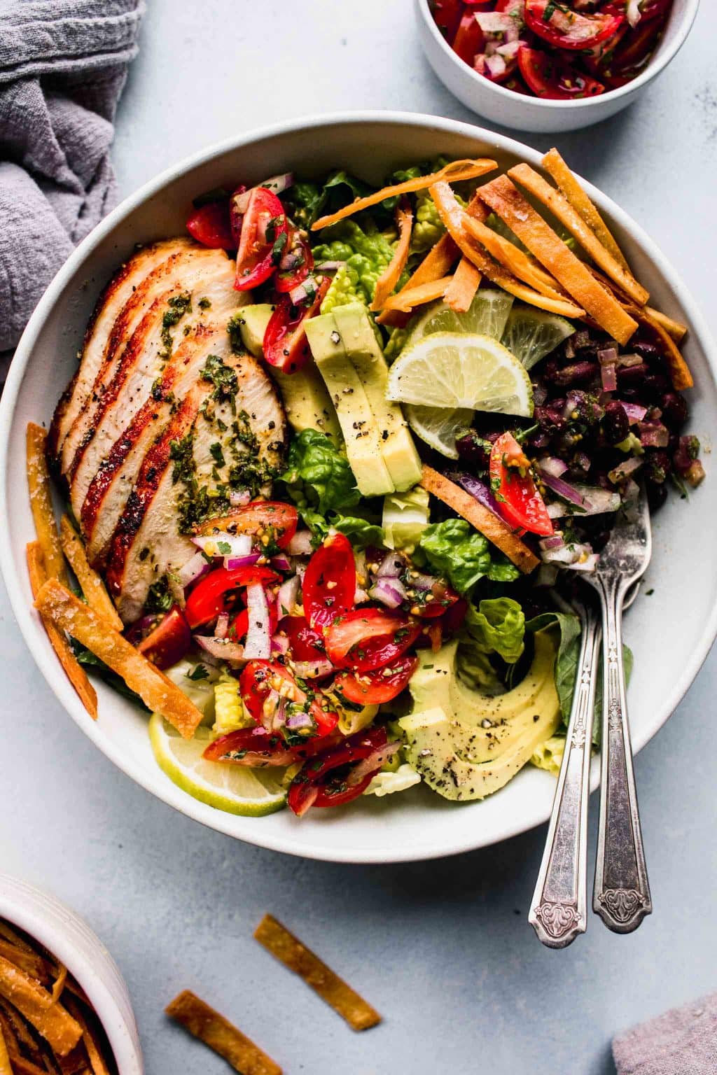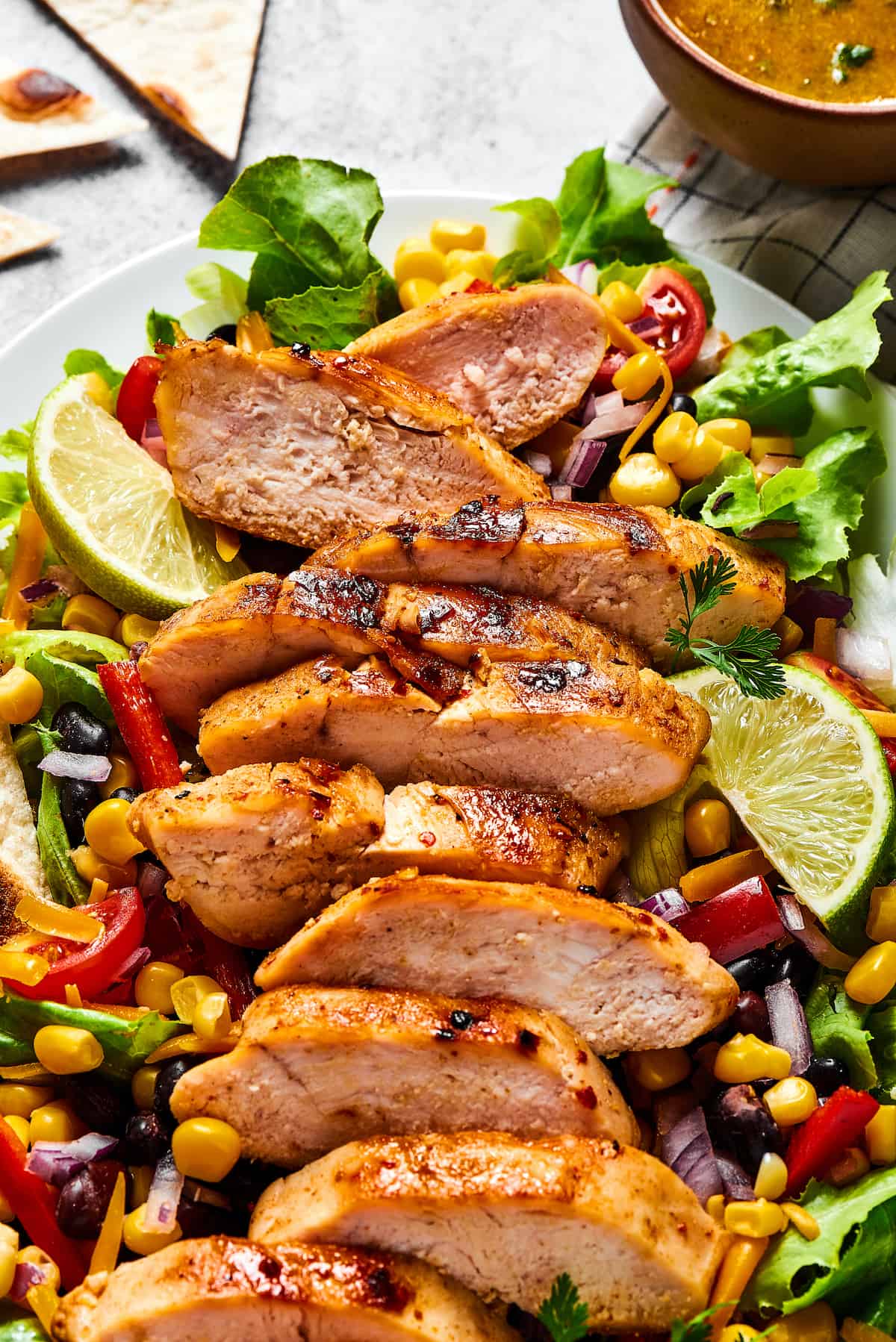 Juicy grilled chicken marinated in a lime-cilantro blend pairs with crisp greens, sweet corn, tomatoes, and creamy avocado. Topped with crunchy pepitas and manchego cheese, this salad is hearty yet light. The homemade dressing doubles as a marinade, making it a versatile and easy option.