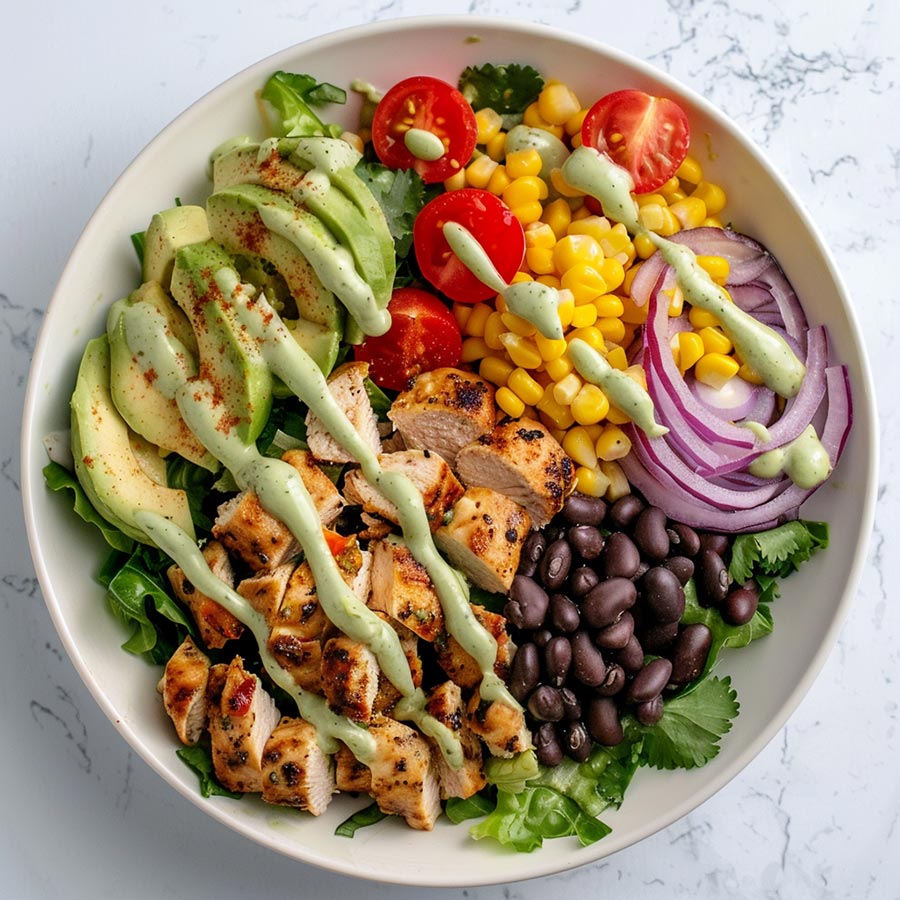 This bright and bold salad combines tender, seasoned chicken with sweet corn, black beans, juicy tomatoes, and creamy avocado. A zesty homemade dressing brings all the flavors together, making it a perfect option for meal prep or an easy dinner.