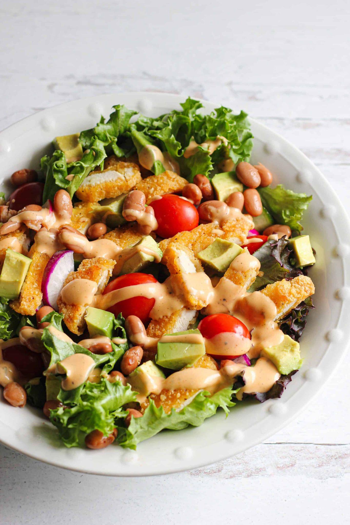 For a quick and satisfying meal, this salad uses crispy chicken tenders paired with fresh greens, cherry tomatoes, radishes, pinto beans, and creamy avocado. Top with your favorite dressing-ranch or something spicy works well-for a hearty, dairy-free dish perfect for lunch or dinner.