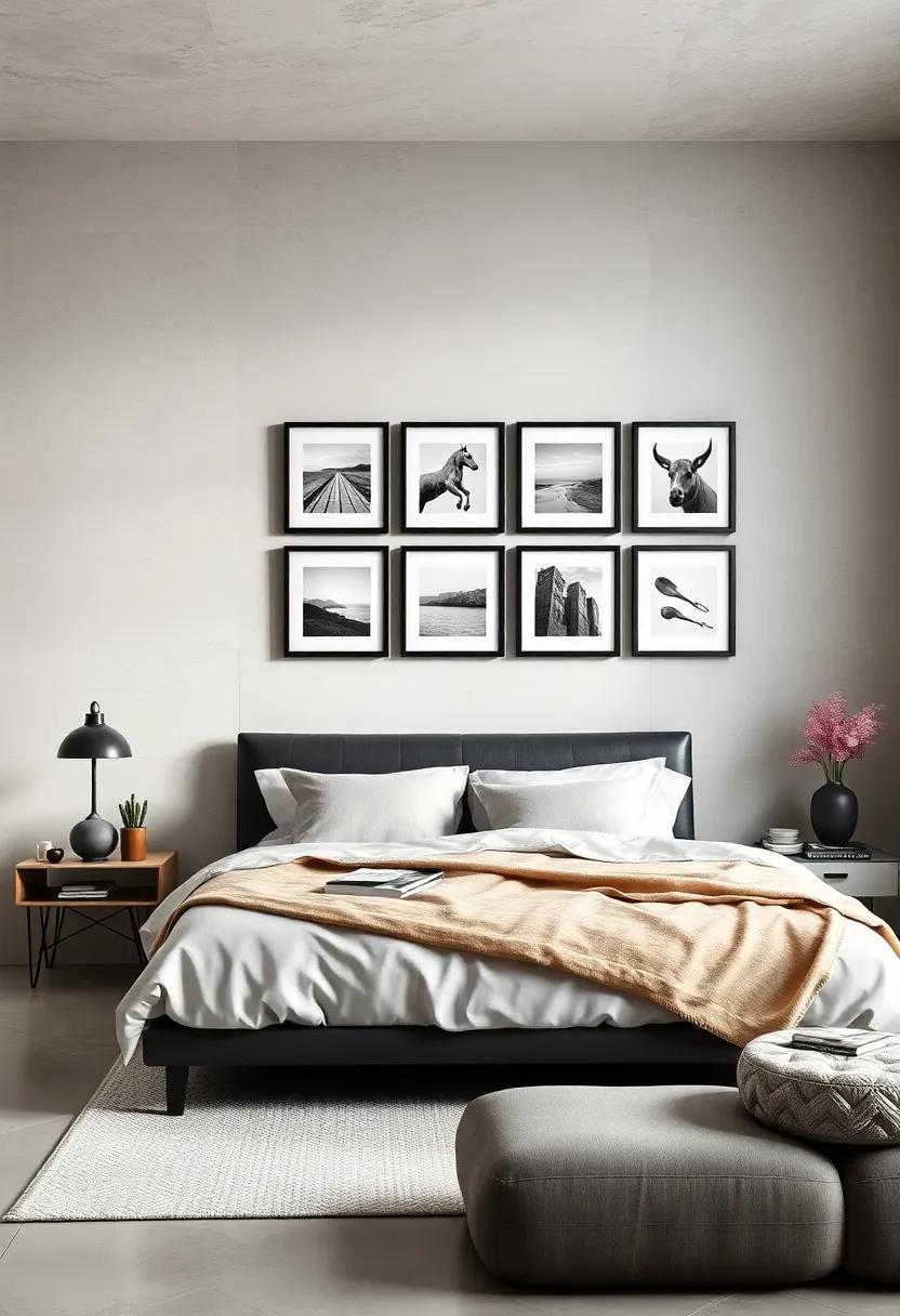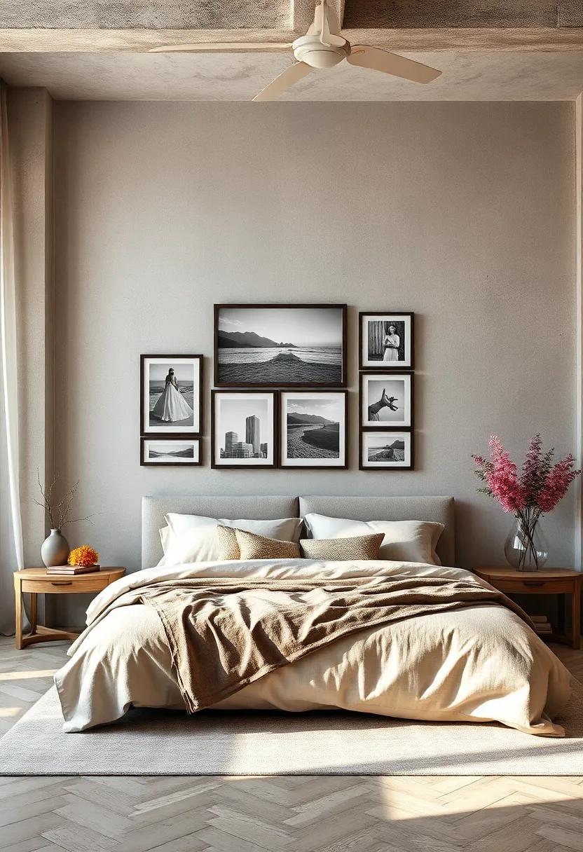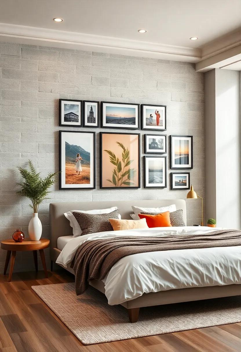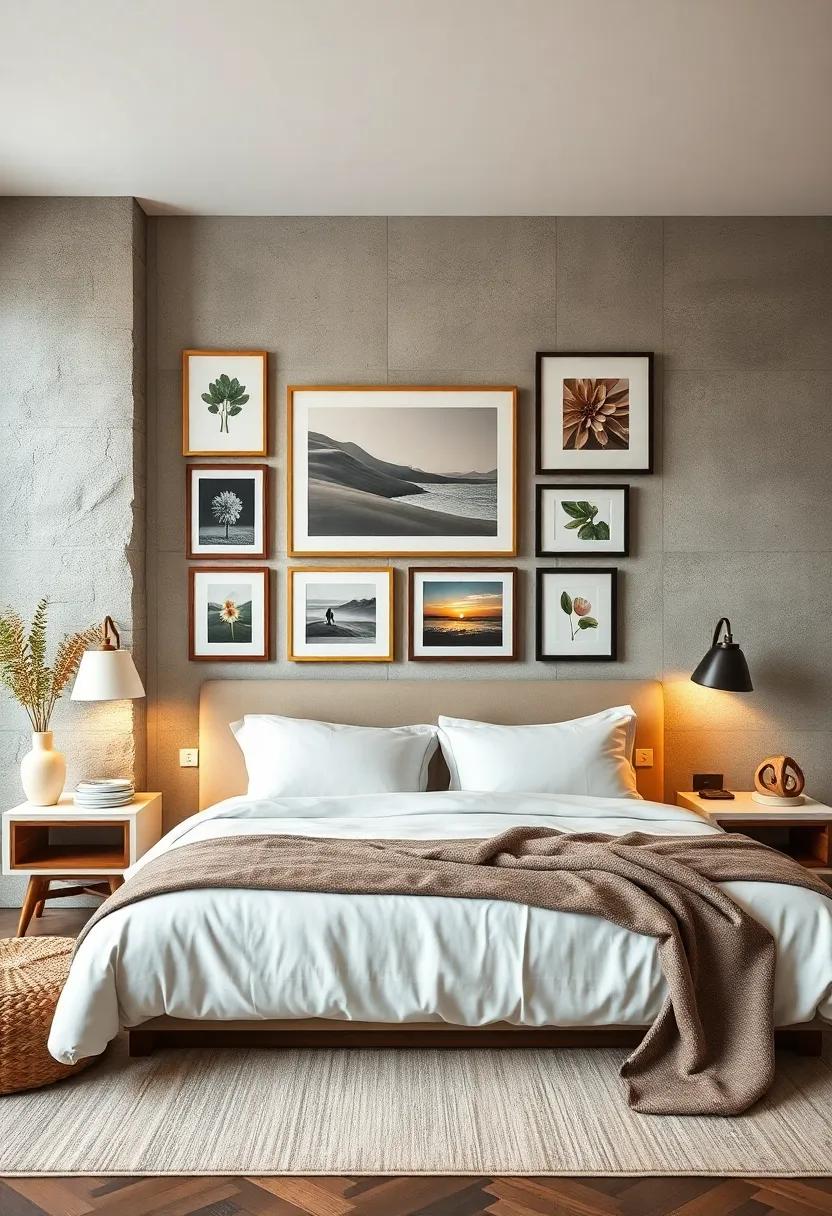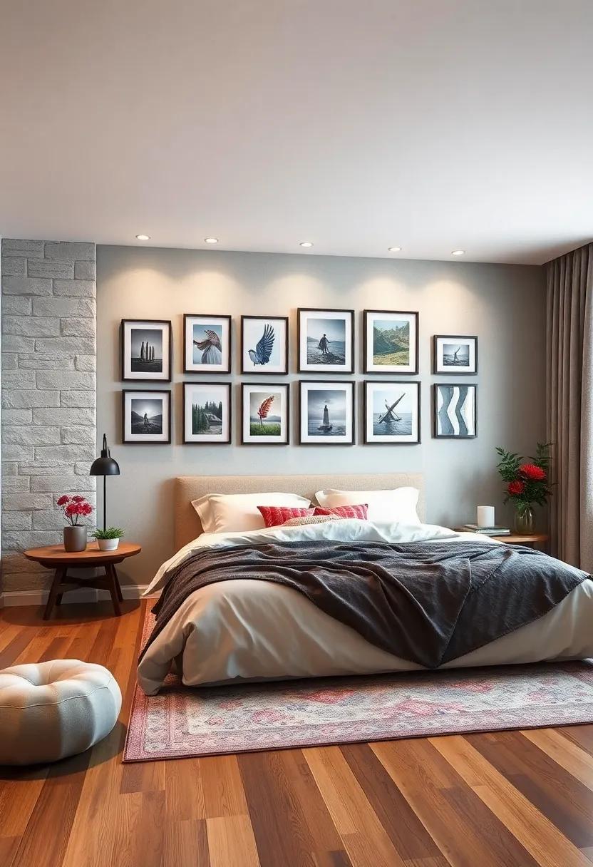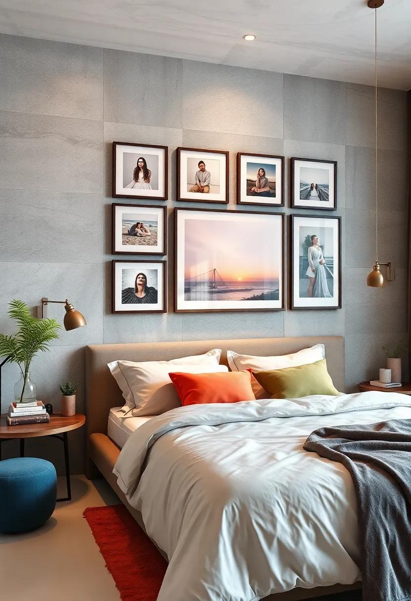 Elevate the artistic vibe of your bedroom by curating a stunning gallery wall that showcases your own photography or pieces from other talented artists. Transforming your wall into a canvas of creativity can be both personal and inspiring. You might arrange an eclectic mix of black and white and colorful prints to create a dynamic visual conversation. Consider using various frame styles — from sleek modern designs to rustic vintage options — to add depth and character to your displays. This can create a captivating focal point that not only reflects your own artistic journey but also invites admiration from guests.
