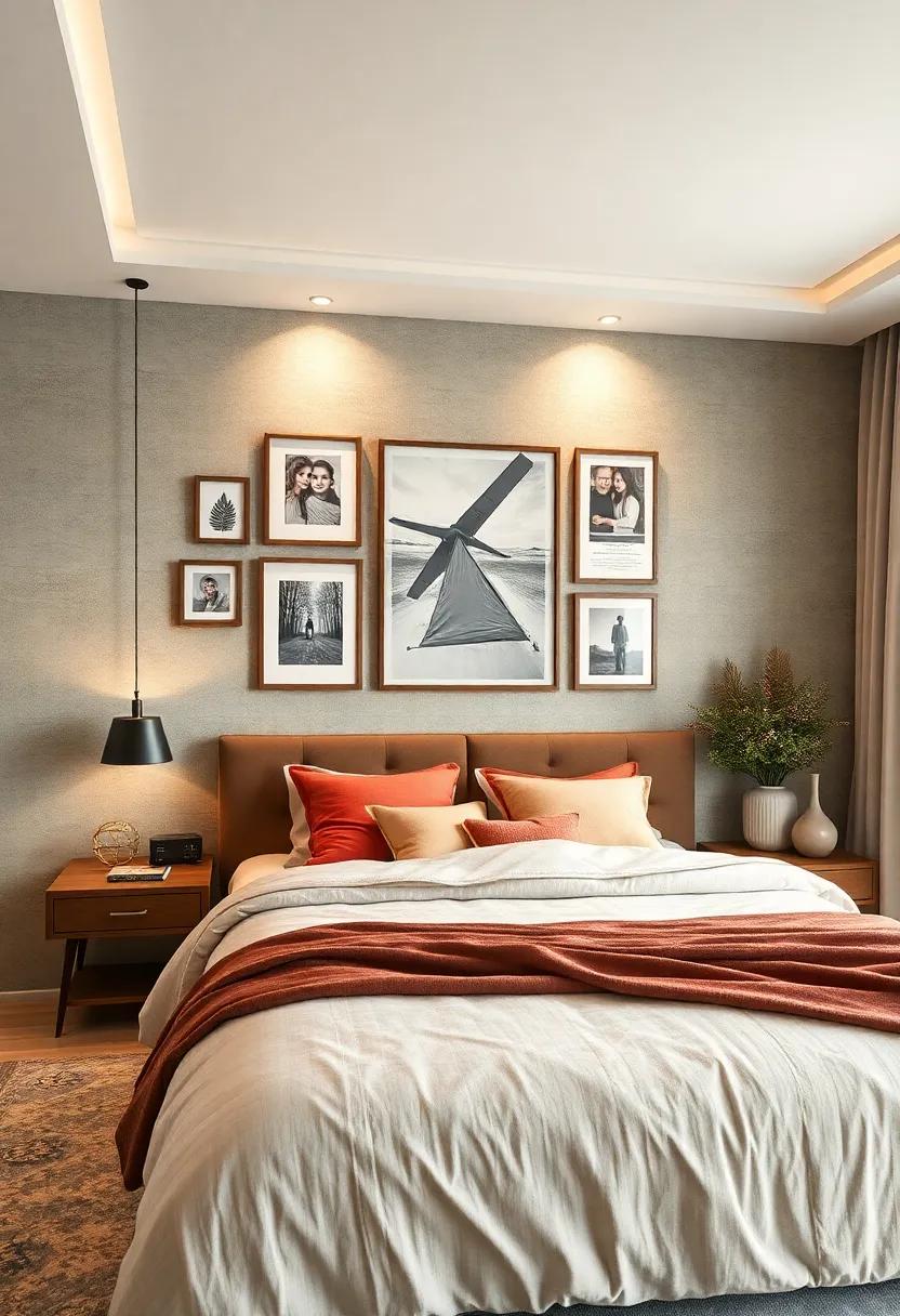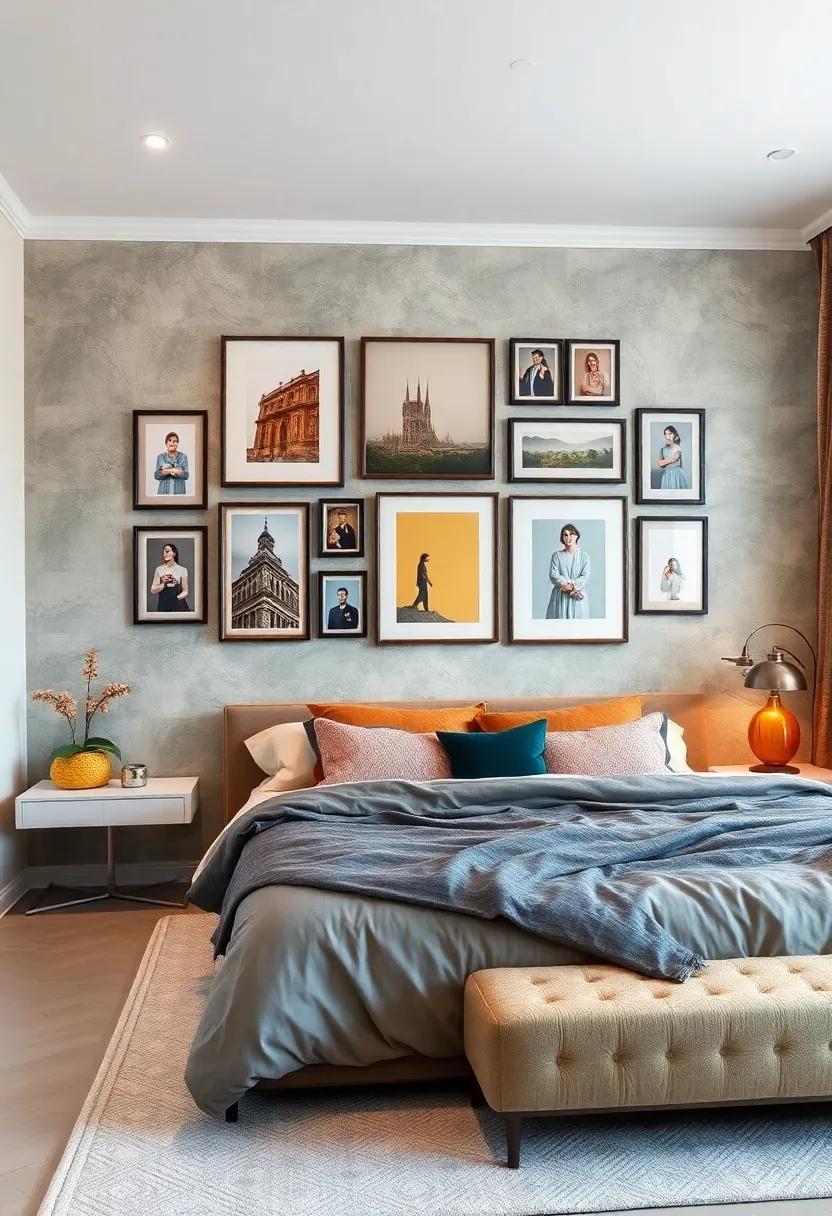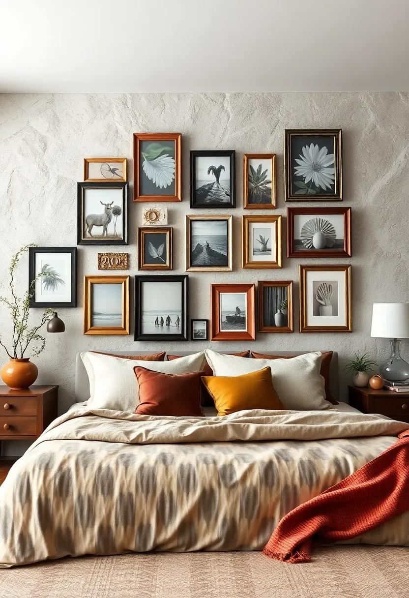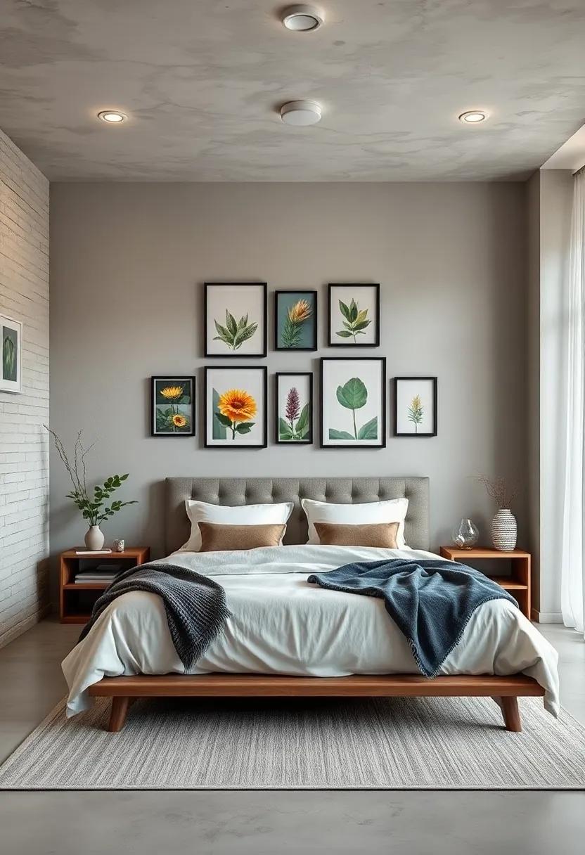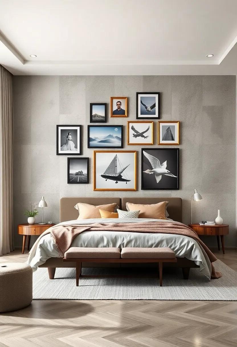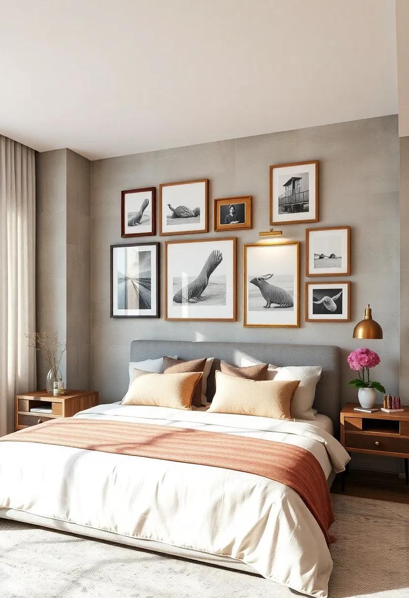 Elevate the artistic vibe of your bedroom by curating a stunning gallery wall that showcases your own photography or pieces from other talented artists. Transforming your wall into a canvas of creativity can be both personal and inspiring. You might arrange an eclectic mix of black and white and colorful prints to create a dynamic visual conversation. Consider using various frame styles — from sleek modern designs to rustic vintage options — to add depth and character to your displays. This can create a captivating focal point that not only reflects your own artistic journey but also invites admiration from guests.