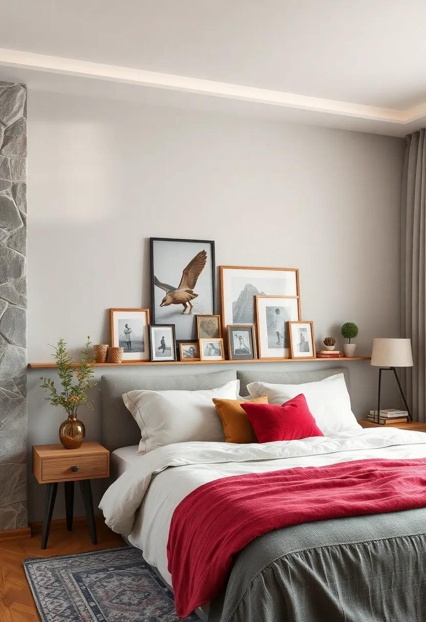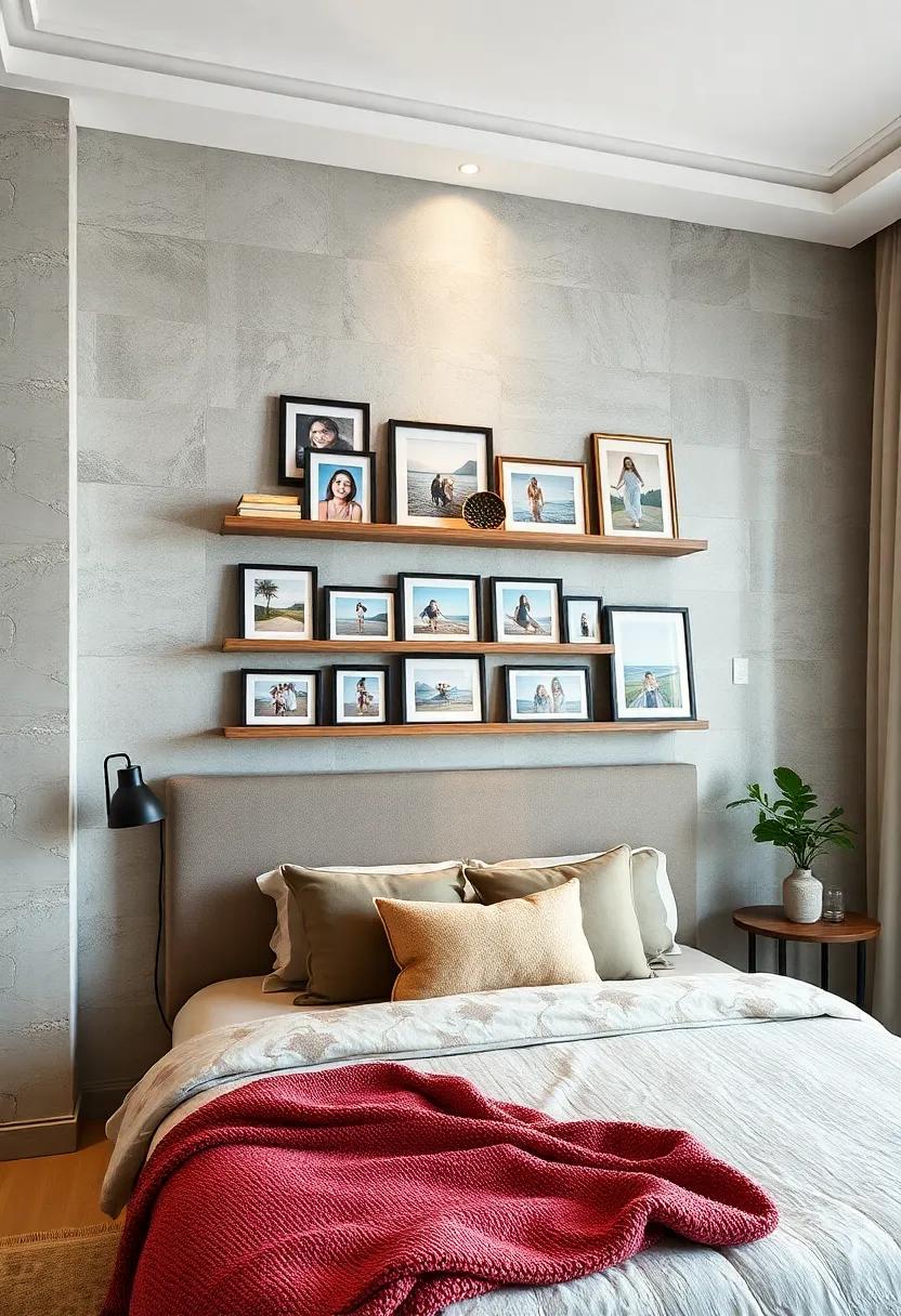 Experimenting with these arrangements will not only showcase your photographs but also invigorate your bedroom atmosphere. Floating shelves empower you to create an evolving narrative on your wall, merging memories with style in a way that speaks to you personally.