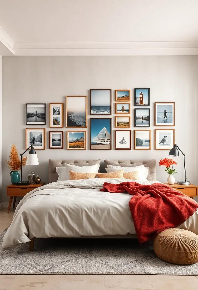 Creating a visually striking gallery wall based on a specific theme can enhance the ambiance of your bedroom, making it a personalized retreat. For a travel theme, use a combination of landscape photos, snapshots from your adventures, and souvenirs like postcards and maps framed in a consistent color palette. This not only brings a sense of wanderlust into your space but also tells a story of exploration and memories. Consider mixing black and white images with vibrant colors to create contrast and depth, all while keeping the overall aesthetic cohesive.