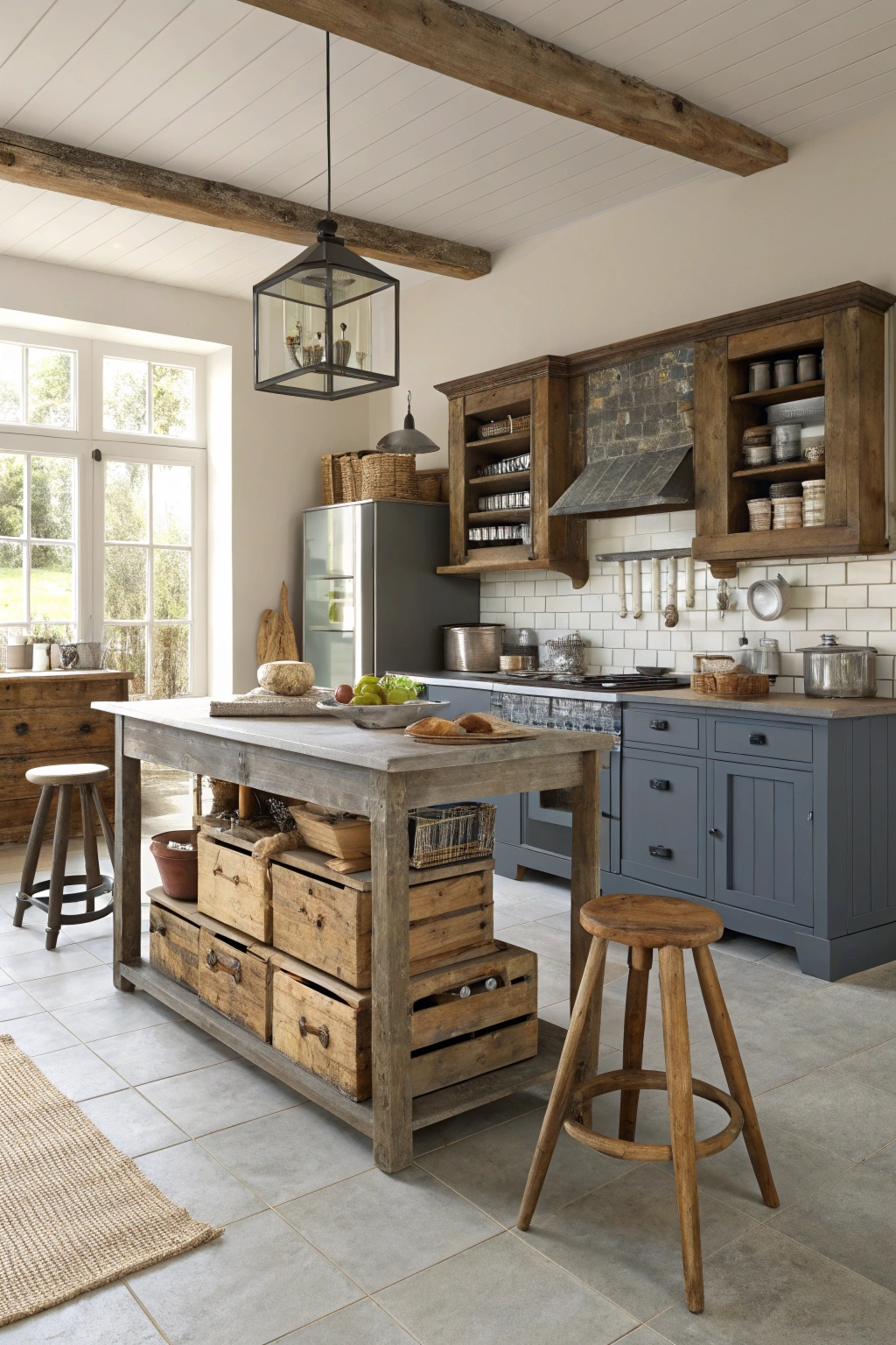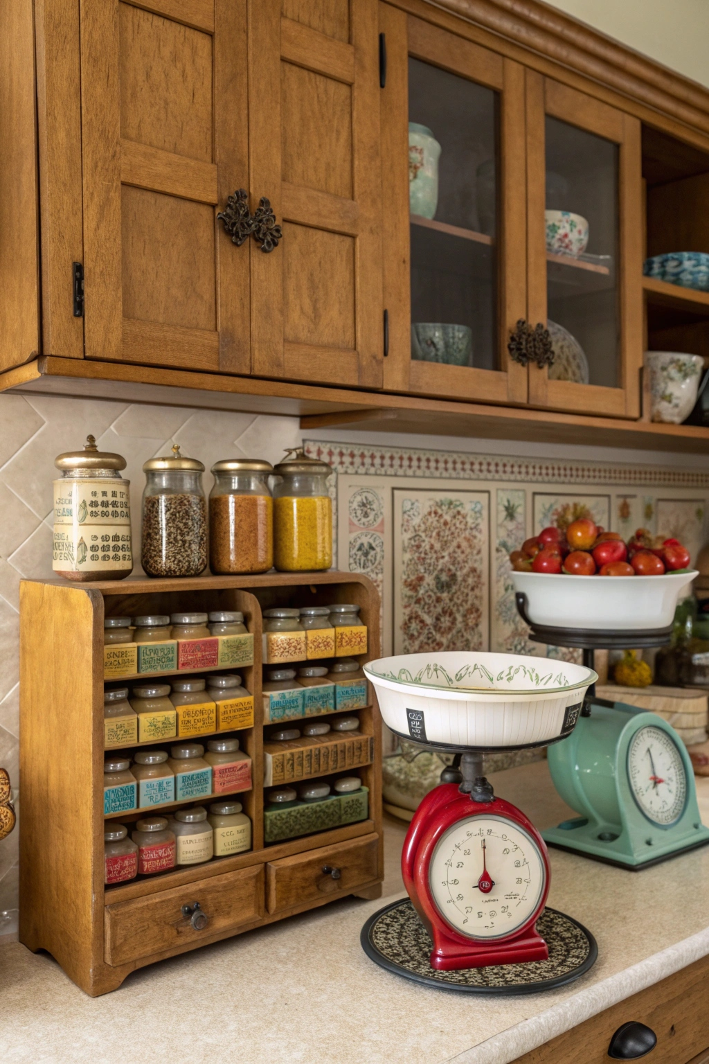 - Rustic wooden spice racks reminiscent of farmhouse kitchens.