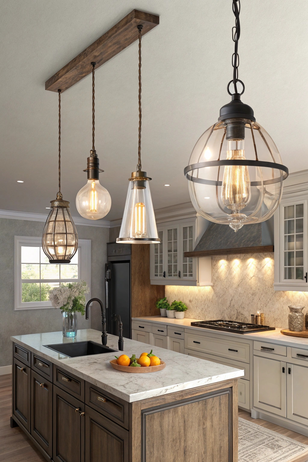 These lighting choices not only brighten your kitchen but also serve as decorative statements.