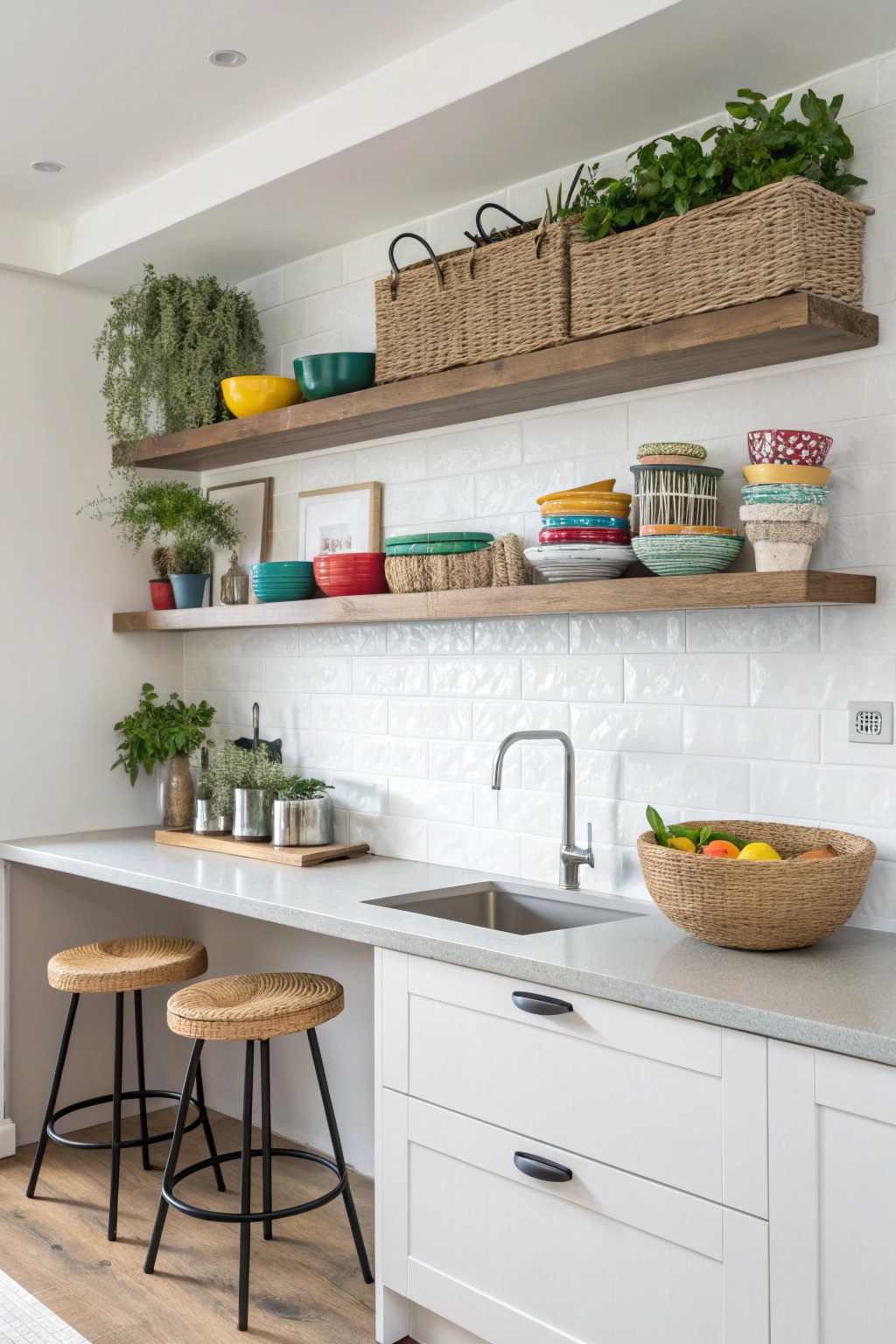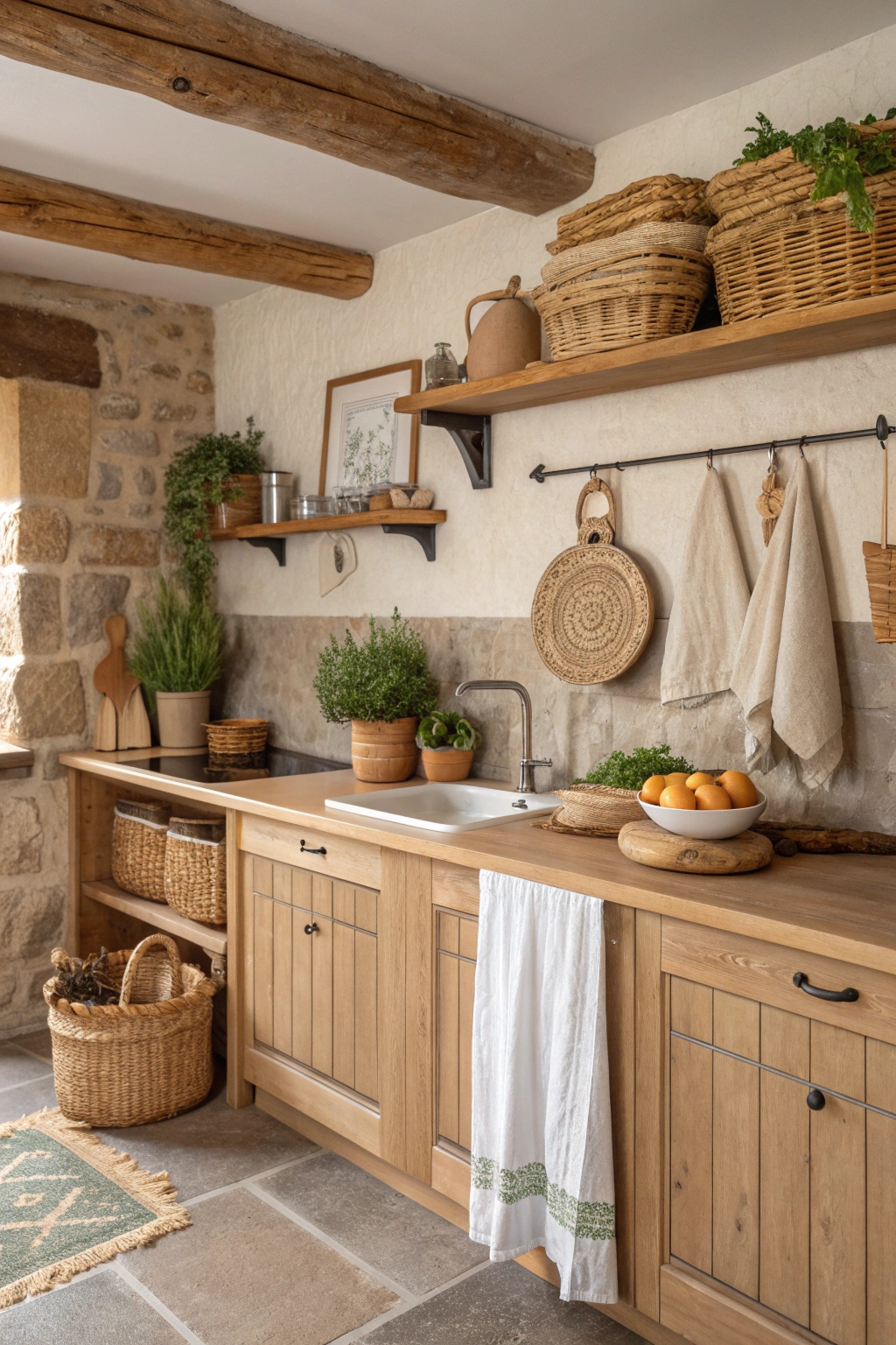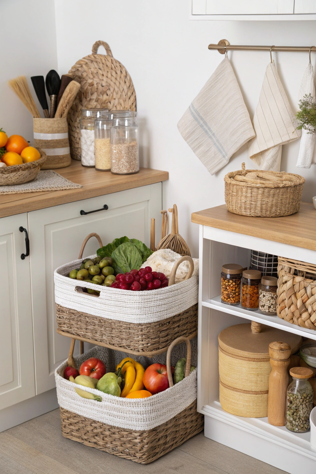 Storage baskets are an elegant way to keep your kitchen tidy while adding texture and warmth. Use woven baskets to hold fresh produce, utensils, or linens. Mixing sizes and materials like rattan, wire, or fabric can create visual interest. Position baskets on open shelves or countertops for easy access and a curated look.