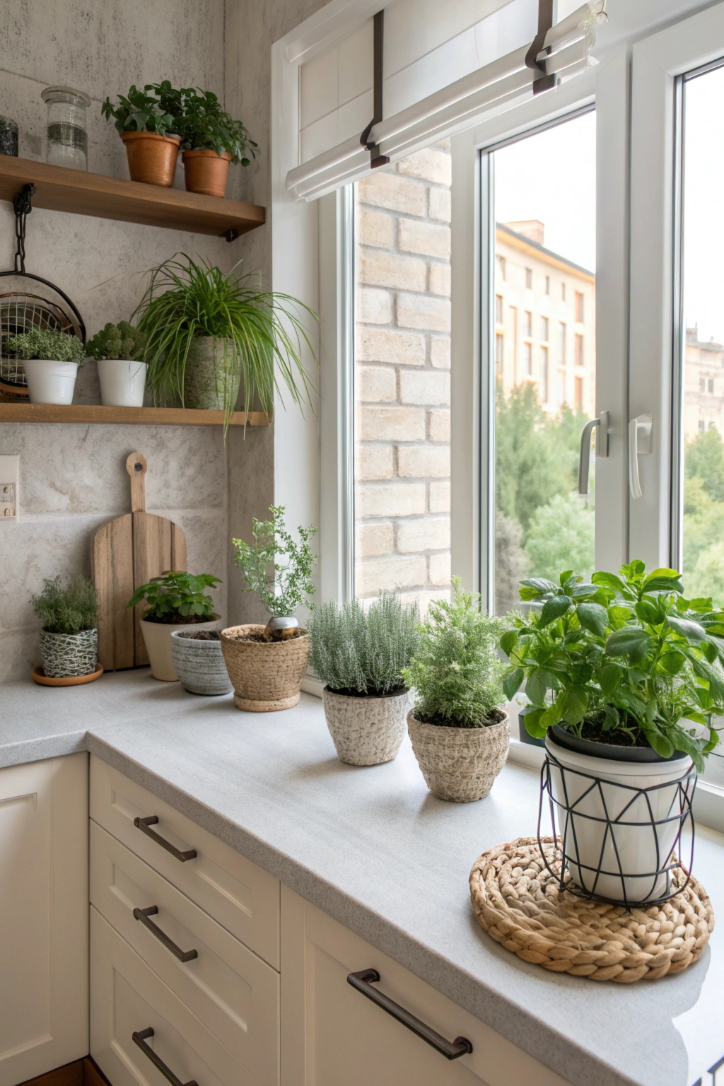 - Fresh culinary herbs like oregano and chives within arm’s reach.
