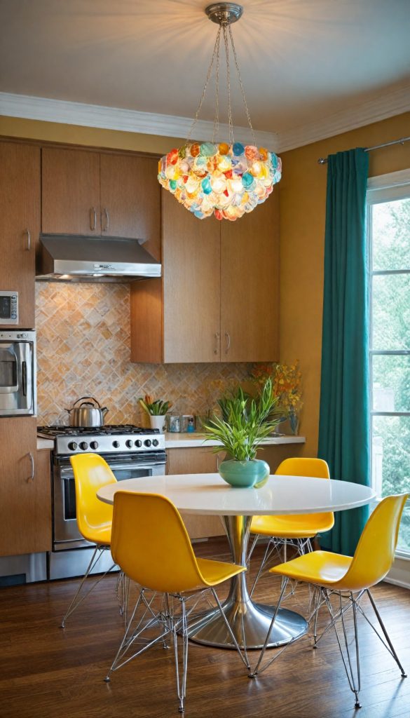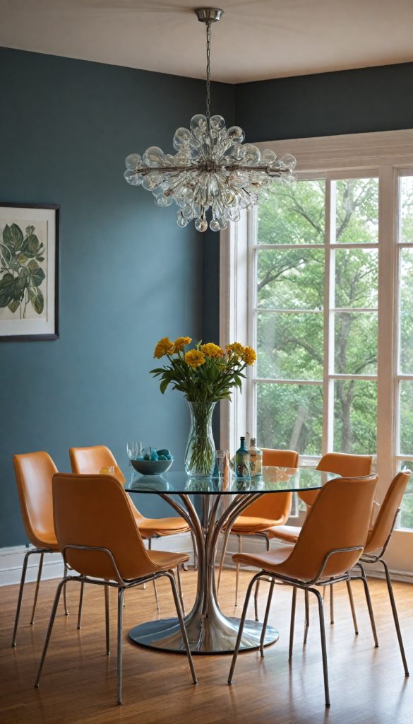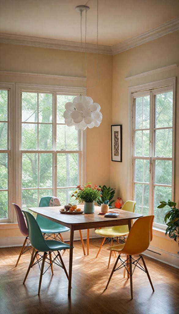 Complement your dining table with chairs reminiscent of the 60s classics, such as those inspired by Eames designs featuring molded plastic seats and wooden legs. Mixing various colors adds a playful and eclectic vibe. For inspiration, browse [Eames-style dining chairs](https://www.amazon.com/s?k=Eames+dining+chairs&tag=stylevane-20).
