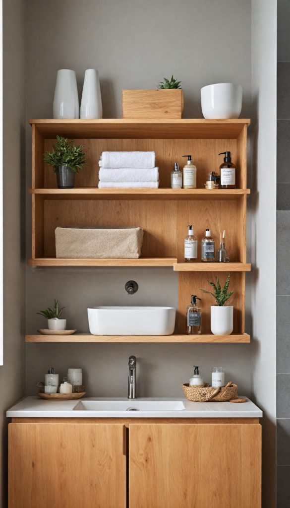Combine functionality with style in your bathroom or living areas using 60s-inspired storage solutions like floating shelves and wall-mounted cabinets in natural wood finishes, keeping your space tidy and visually appealing.