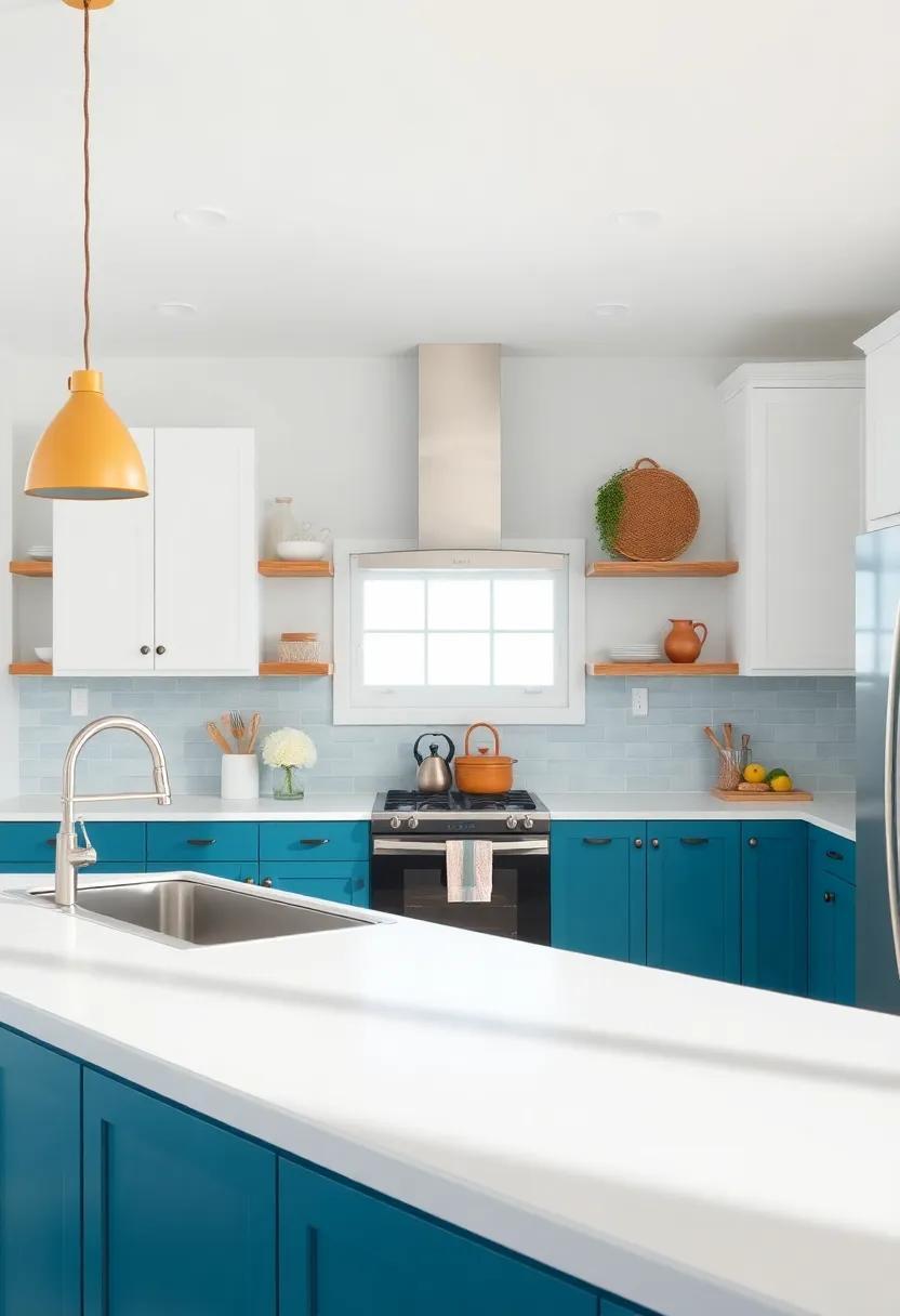 - Light-colored countertops: A soft white or sandy beige surface can provide a balanced contrast against vibrant cabinetry.
