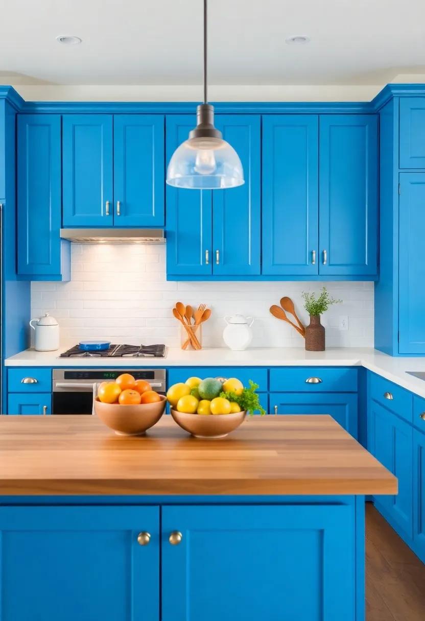 To enhance the cheerful ambiance, pair your bright blue cabinets with warm, natural materials. Consider incorporating elements such as: