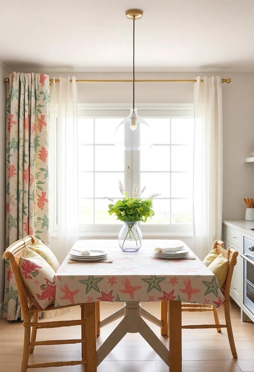 Coastal Textiles: Choose kitchen curtains, tablecloths, and cushions in light, airy fabrics adorned with coastal patterns—think coral, starfish, and waves
