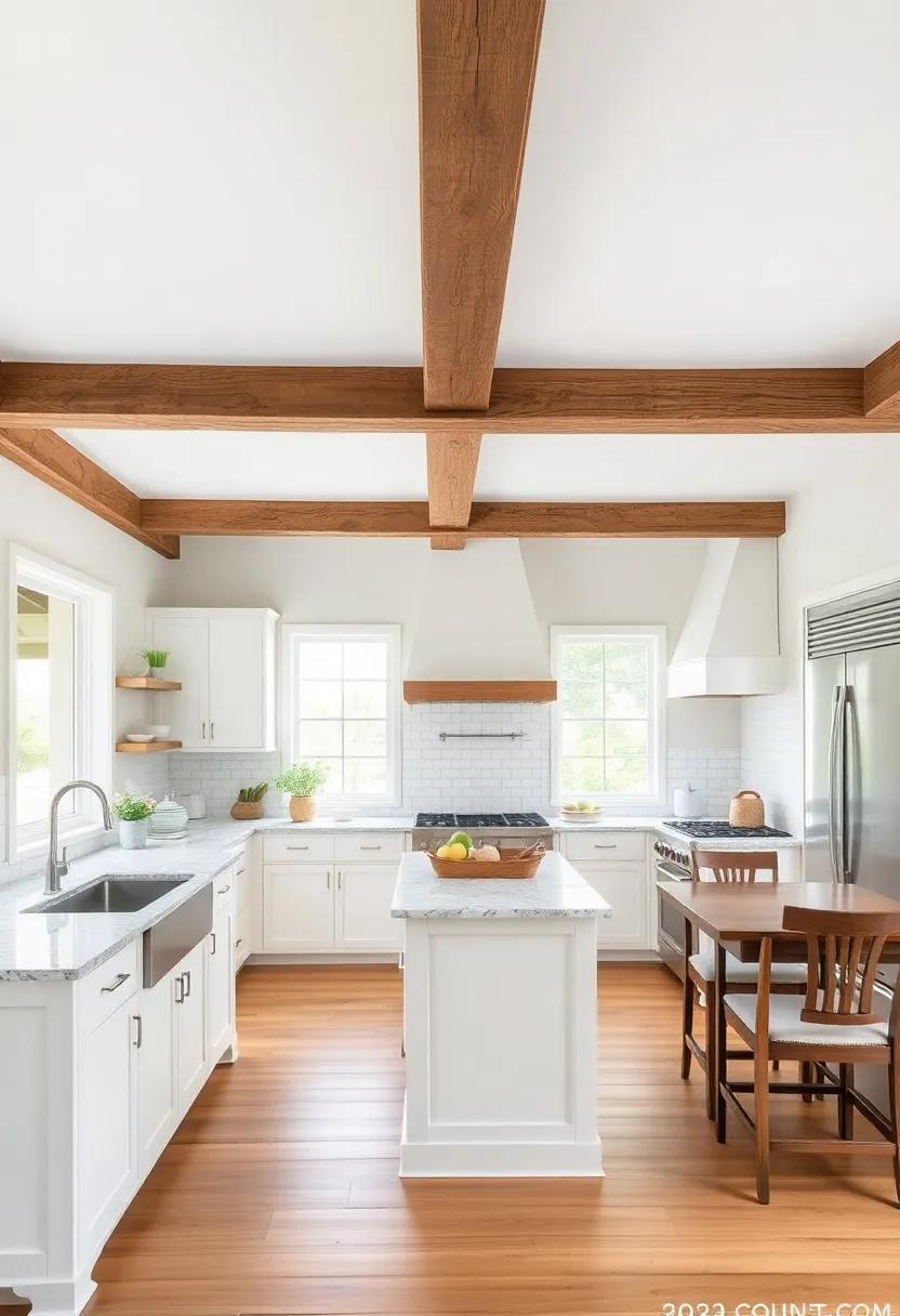 When styling your kitchen with these wooden accents, consider pairing them with coastal decor elements that enhance the overall ambiance. Here are some ideas to integrate wooden beams beautifully into your kitchen design: