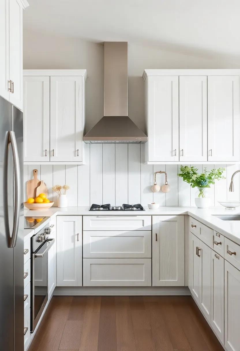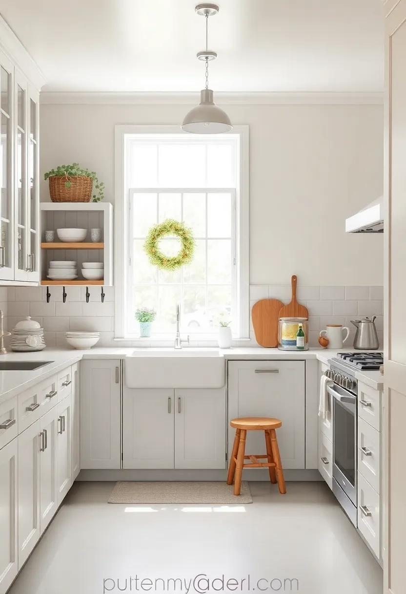 - Cabinetry: Opt for soft white or pale beige cabinets that reflect light and make the kitchen feel spacious.