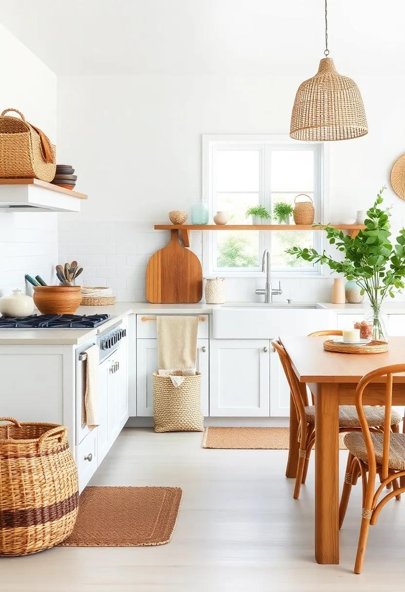 Transform your kitchen into a serene seaside haven by incorporating a variety of tactile elements that echo the beauty and warmth of the coast.Start with woven baskets, which not only add storage but also introduce natural textures that bring a homely touch. Set them on open shelves or hang them on the walls for a decorative flair.Layering in jute rugs will not only boost comfort underfoot but also infuse an earthy charm reminiscent of sandy shores. For a breezy touch, drape linen textiles over your kitchen chairs and countertops; they offer a soft, inviting ambiance while providing a practical solution for spills and splatters.