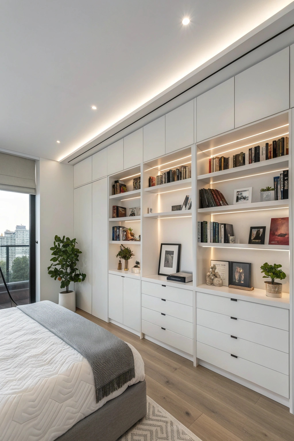 Maintaining order in a minimalist bedroom is effortless with elegant storage options that blend style and utility. Consider incorporating: