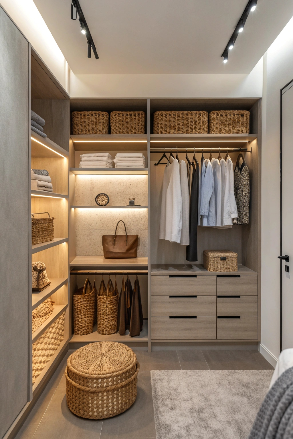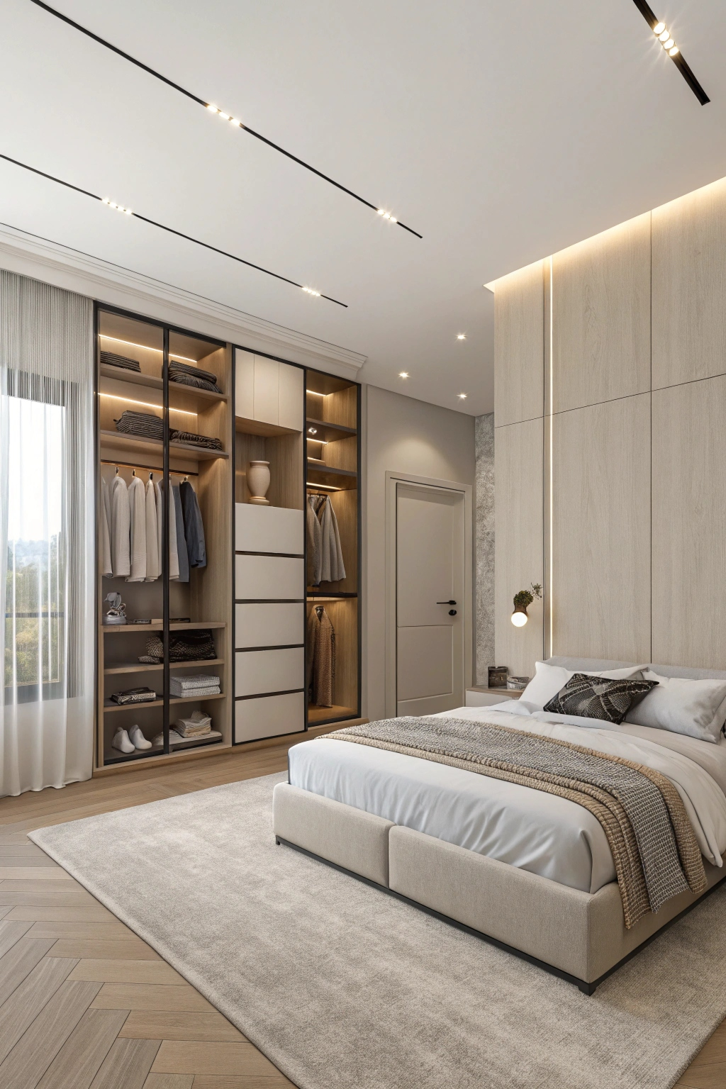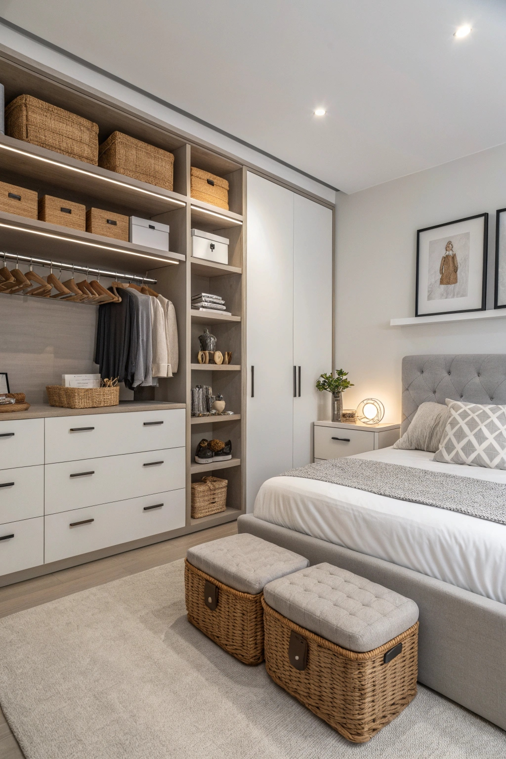 Open closets offer a stylish and practical way to organize your wardrobe while enhancing the room’s spacious feel. Ideas to consider include: