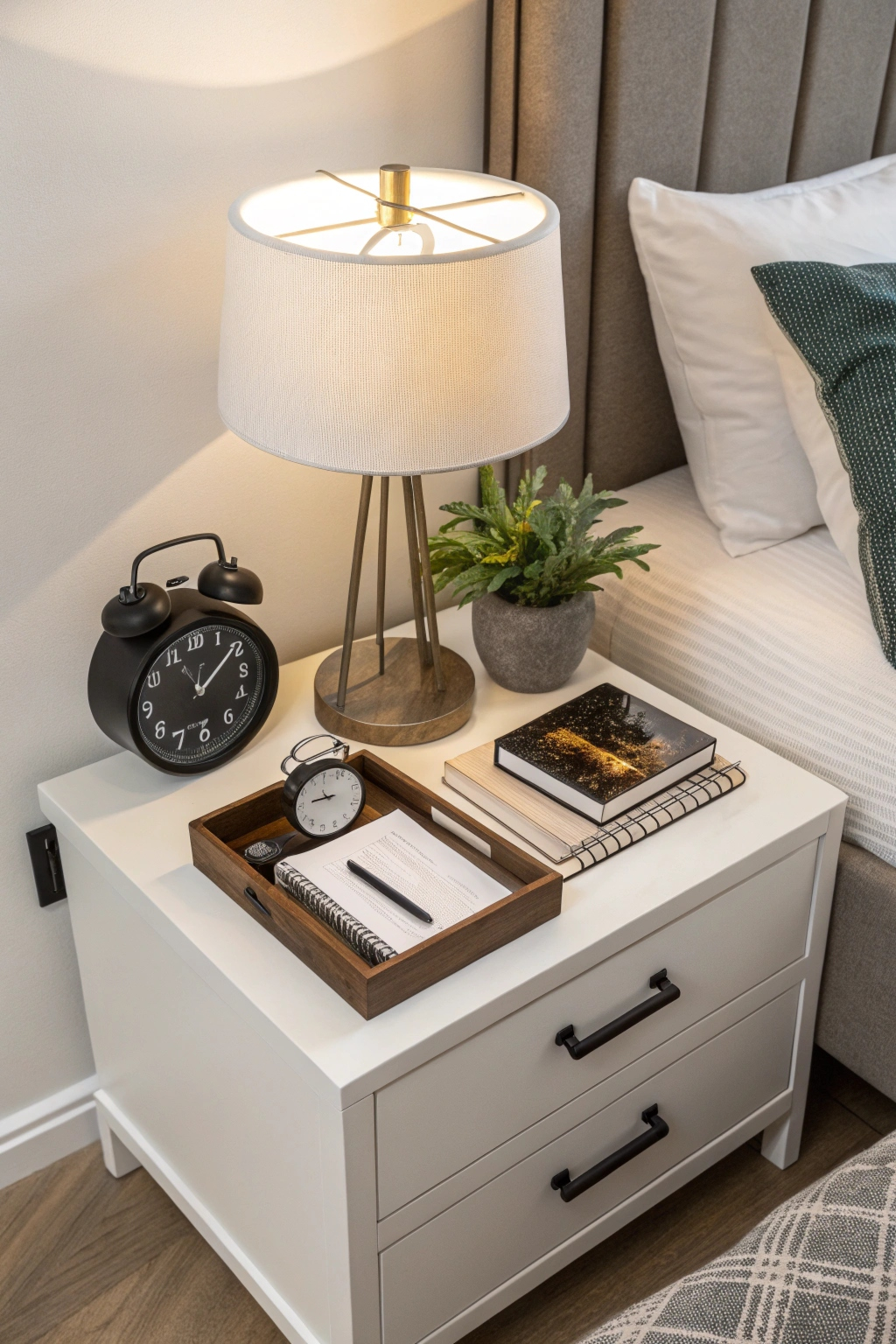 Keep your bedside area tidy by limiting nightstand items to essentials. A minimalist nightstand might include: