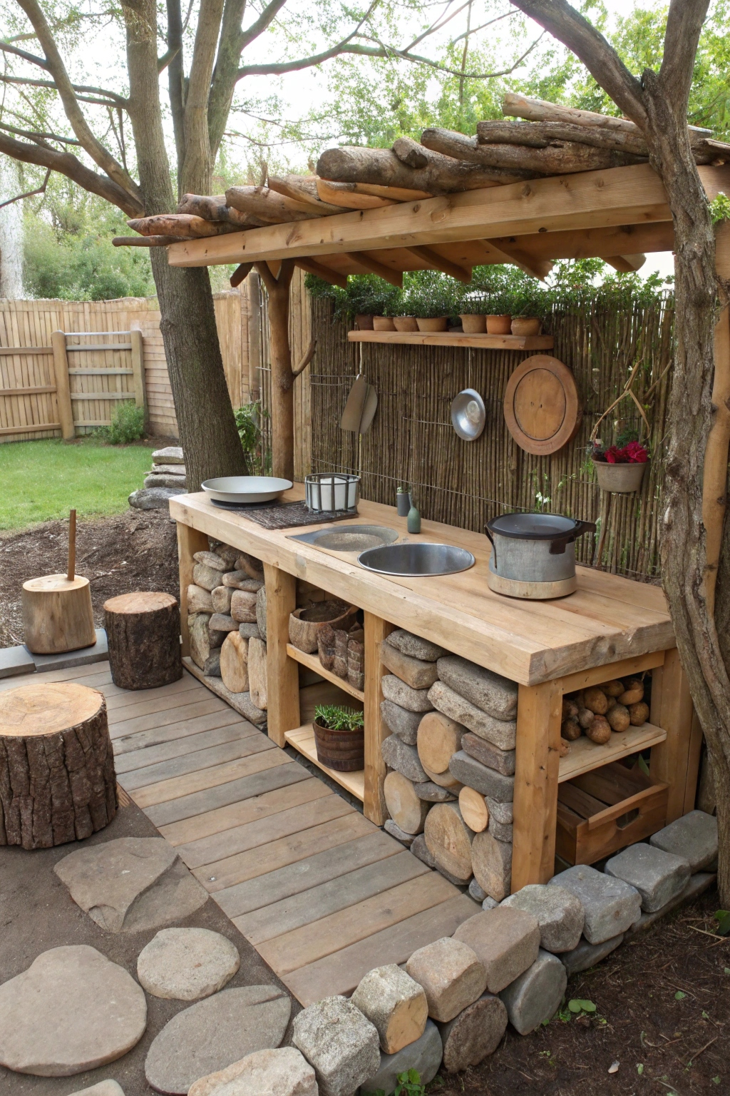 Incorporate the beauty of nature by building a mud kitchen using smooth stones and robust wooden planks. Flat stones make excellent work surfaces, while logs or branches can double as seating. This naturalistic approach not only blends seamlessly with your garden but also stimulates sensory exploration and imaginative play.