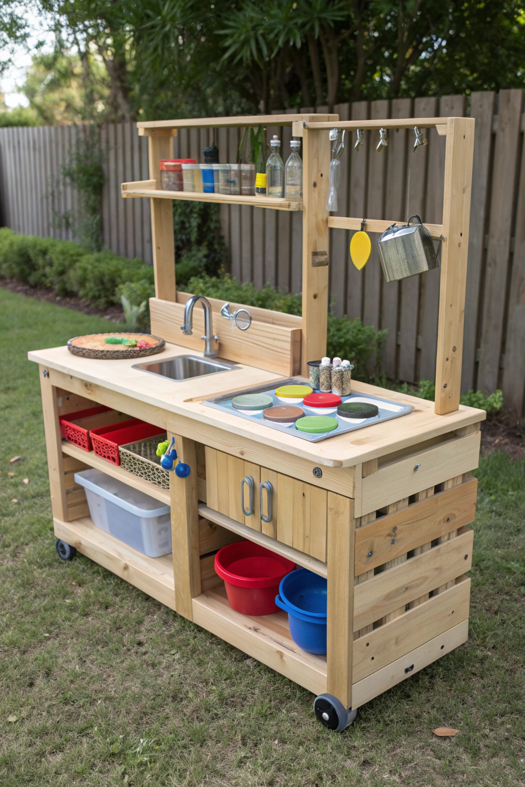 A mud kitchen mounted on wheels offers unparalleled versatility, allowing you to relocate the play area to sunny spots or shaded corners as needed. Constructed from durable wood or heavy-duty plastic, this portable kitchen includes various containers for mixing and serving. This mobility encourages active play and exploration across your outdoor space.