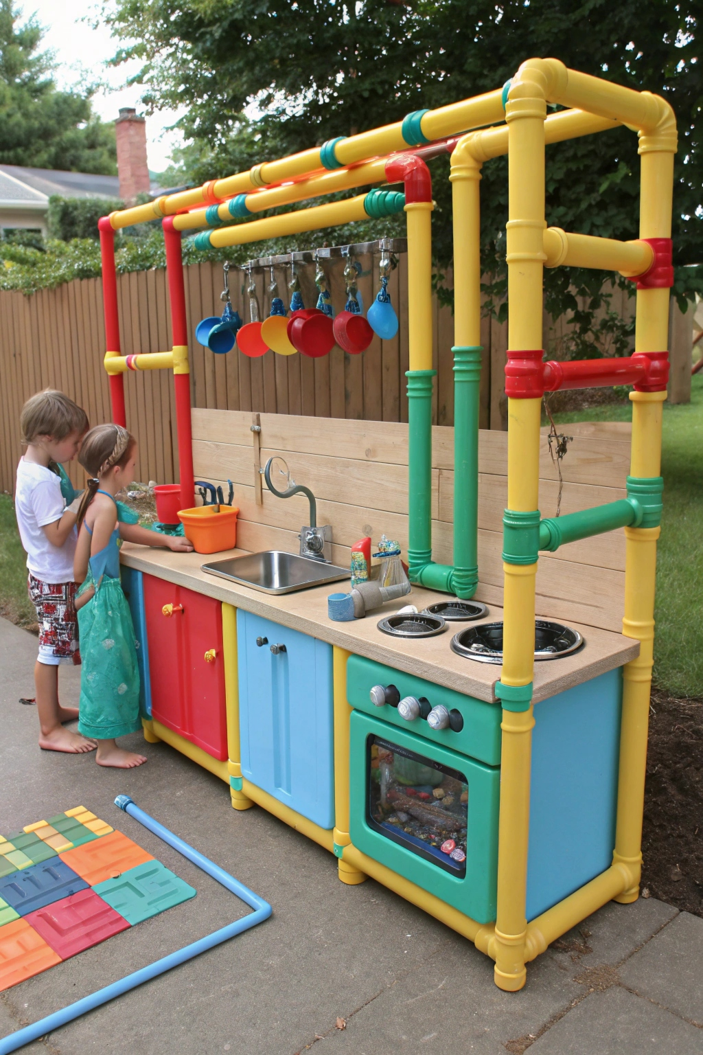 Inject a splash of color into your backyard with a mud kitchen crafted from brightly painted PVC pipes. This playful structure can be customized with various pipe diameters and connectors to create tunnels and channels for water and mud flow. The vivid hues and interactive design captivate children’s attention, promoting sensory and imaginative play.