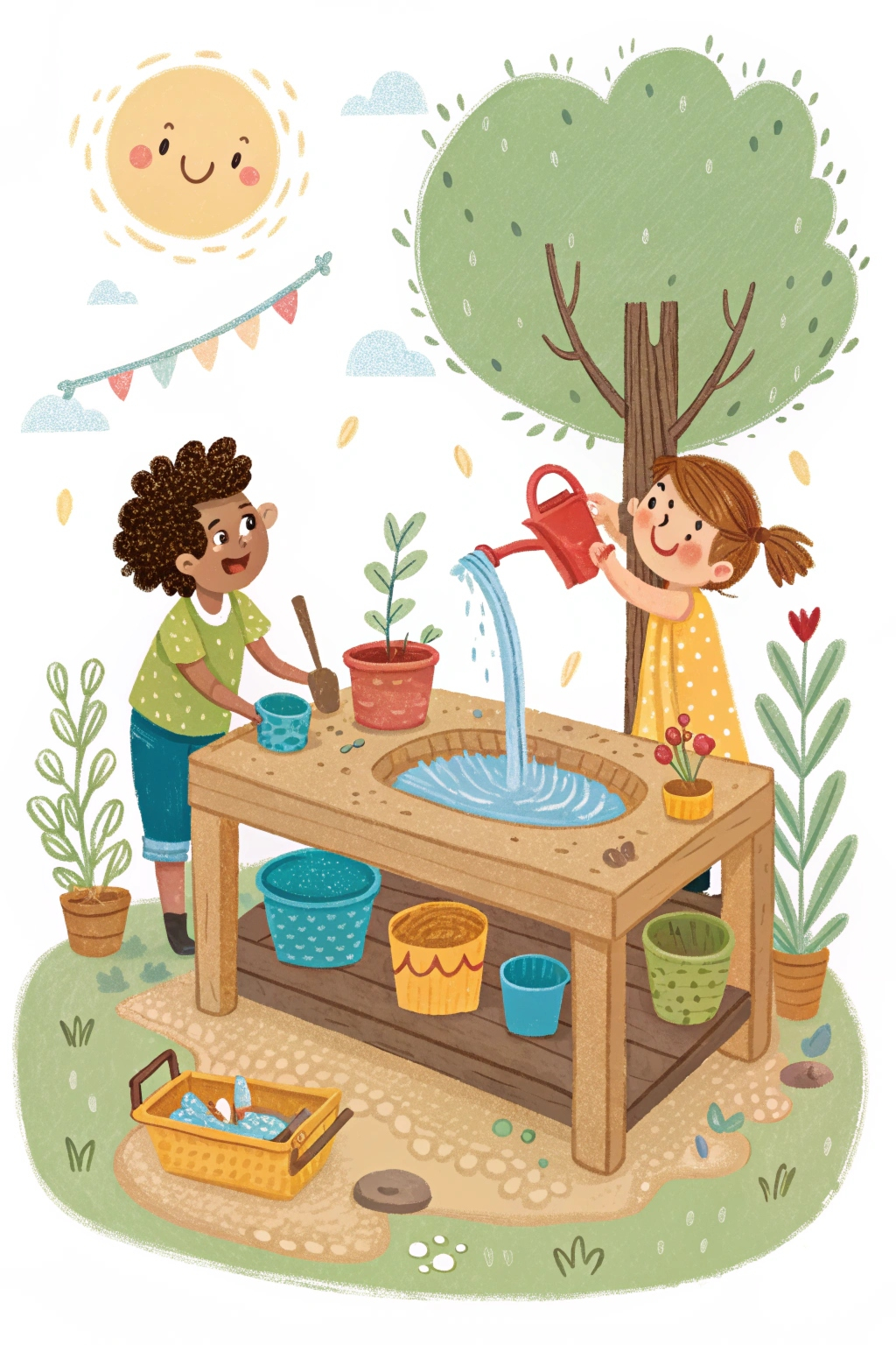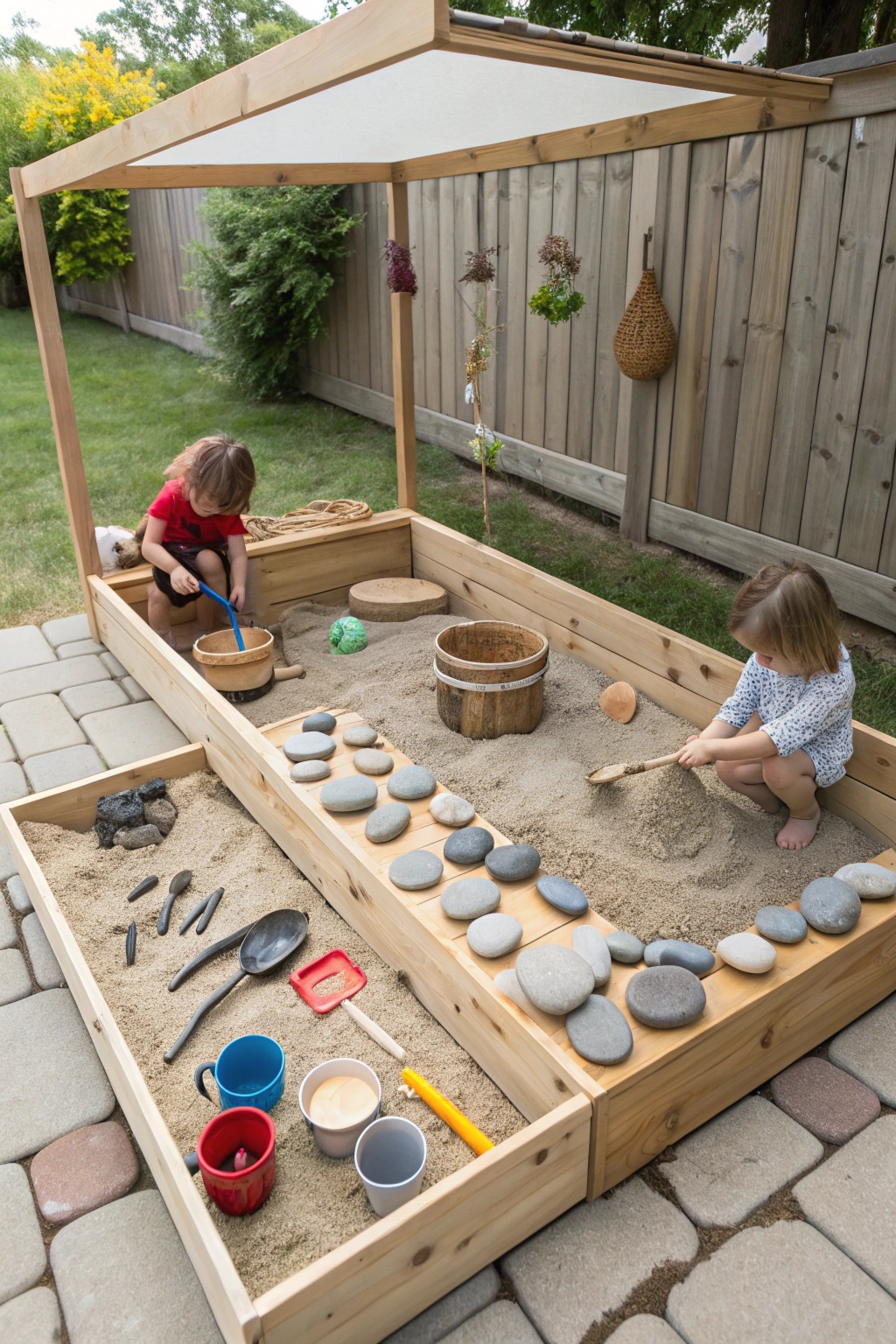 Keep it simple with a minimalist sand and mud station that encourages open-ended play. Incorporate natural elements like smooth stones and sticks, a compact sandbox or mud container, and basic utensils such as cups, scoops, and shovels. This streamlined setup invites children to experiment freely and enjoy the tactile pleasures of outdoor play.