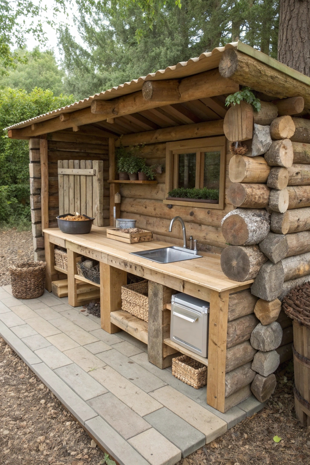 Bring rustic allure to your backyard with a log cabin-style mud kitchen. Utilize sturdy logs for seating, weathered wooden crates for storage, and a stone or gravel base to mimic a cozy cabin floor. This naturalistic design invites children to immerse themselves in imaginative play, blending outdoor exploration with creative cooking.