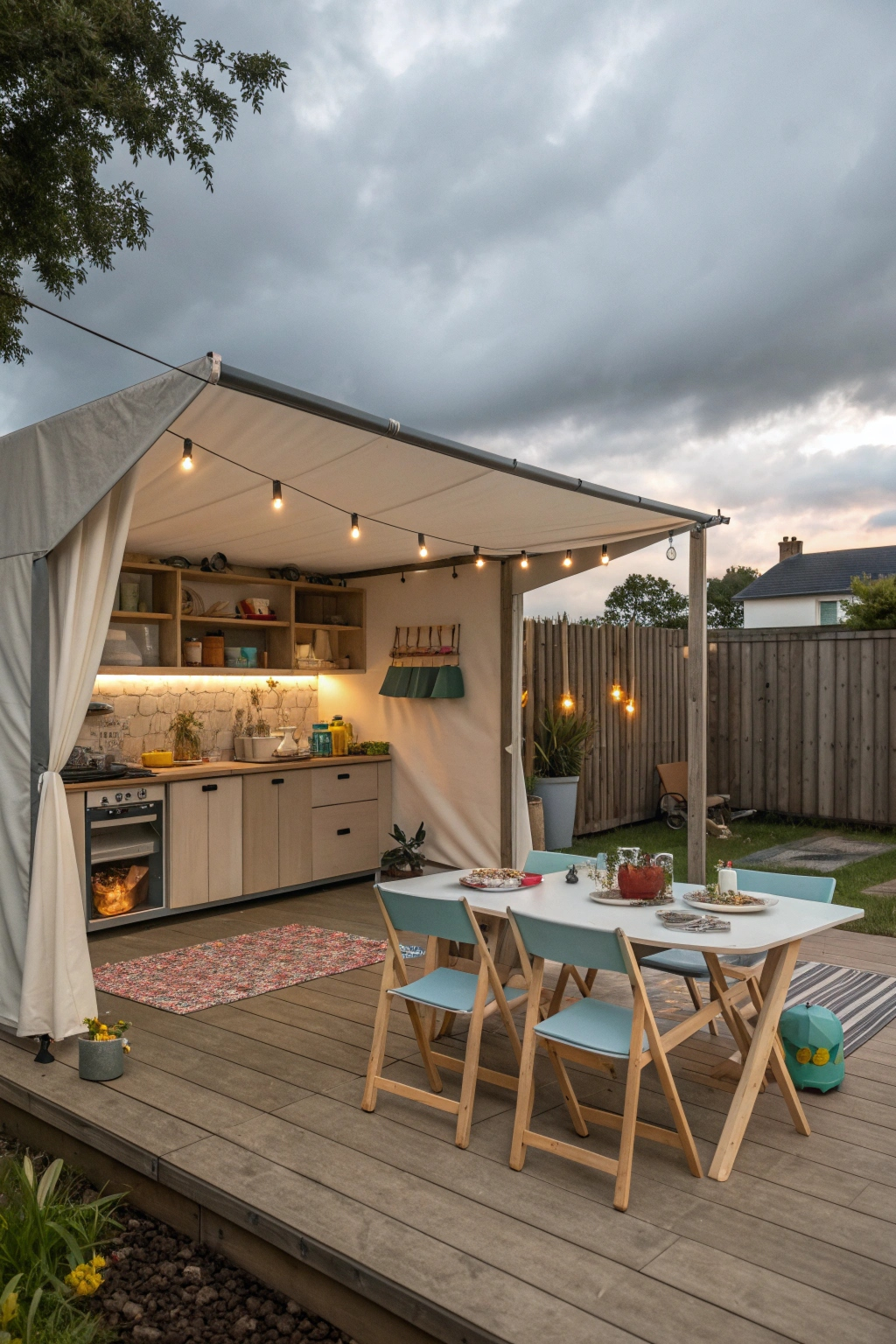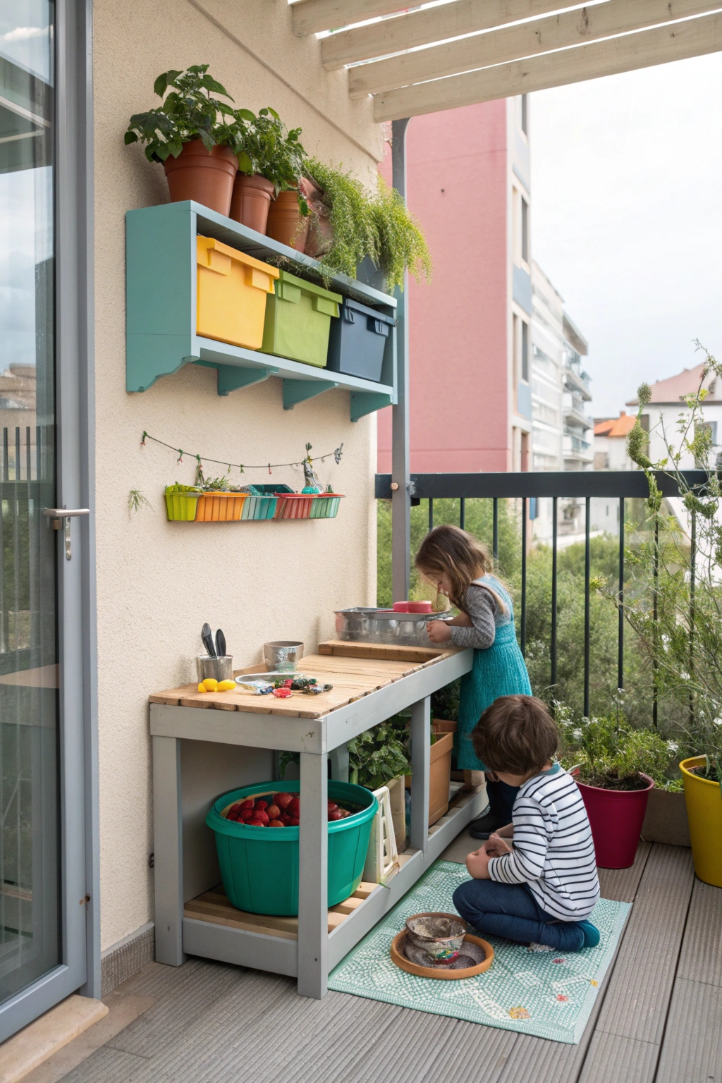Maximize limited outdoor areas by designing a compact mud kitchen for your balcony. Utilize a sturdy table or repurposed shelf as a work surface, add storage bins to keep materials organized, and incorporate potted plants to bring nature closer. This efficient setup offers a vibrant play zone without sacrificing space.